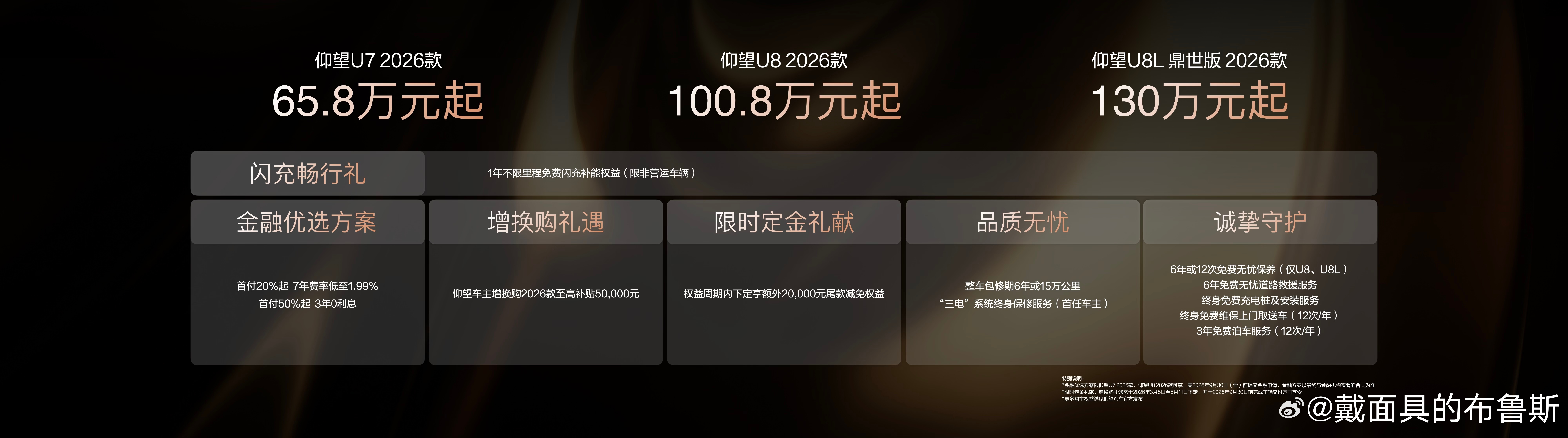 仰望加闪充的组合是真的把新能源高端车的体验拉满了!U7、U8、U8L鼎世版一起上新,价格从 65.8 万起,不管是追求驾趣、越野还是行政豪华,都能找到对口的选择。最让人惊喜的还是全系的闪充技术,5 分钟就能充到 70%,9 分钟直接满电,零下 30 度也只多花 3 分钟,彻底跟充电等待说拜拜,补能效率直接追上加油了。
