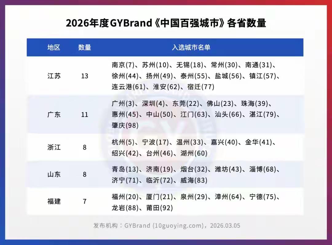 城市 魅力 老徐排名44,表现平平。3月5日,城市指数研究机构GYBrand独家编制的《2026年度中国百强城市指数》正式揭晓。江苏13个地级市全部上榜,广东有11个,浙江和山东各占8个。在前十名中,江苏占据2席,南京位列第7,苏州排在第10。徐州排名第44,为苏北五市之首。徐州竟不敌金华、潍坊,着实有些奇怪。扬州排名49,领先排名56的盐城不少。如此一来,二者真有了二线与三线城市的差距。大临沂的排名竟在淄博、济宁之后,实在是令人有些伤自尊了。 江苏 广东 浙江 山东 临沂 扬州