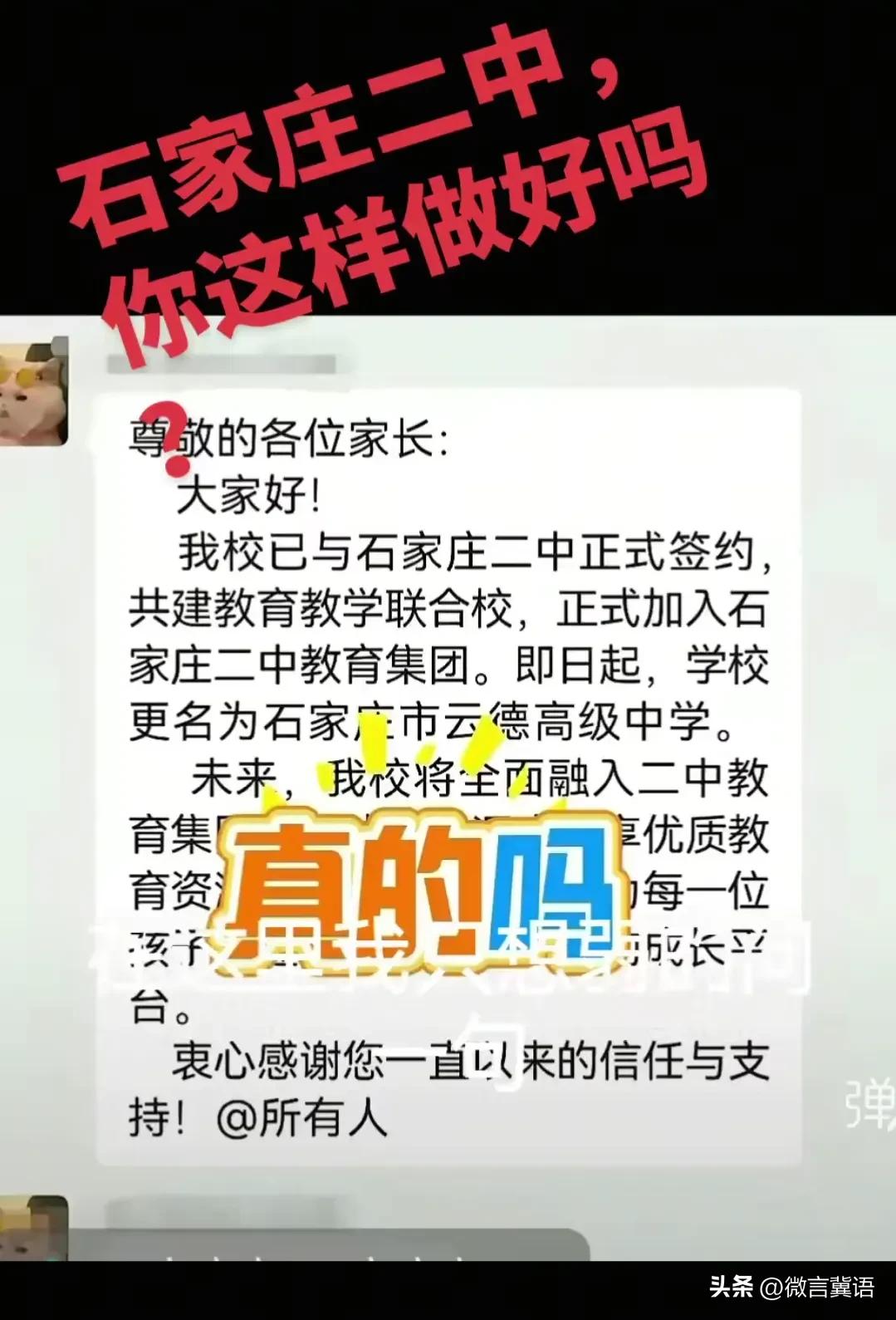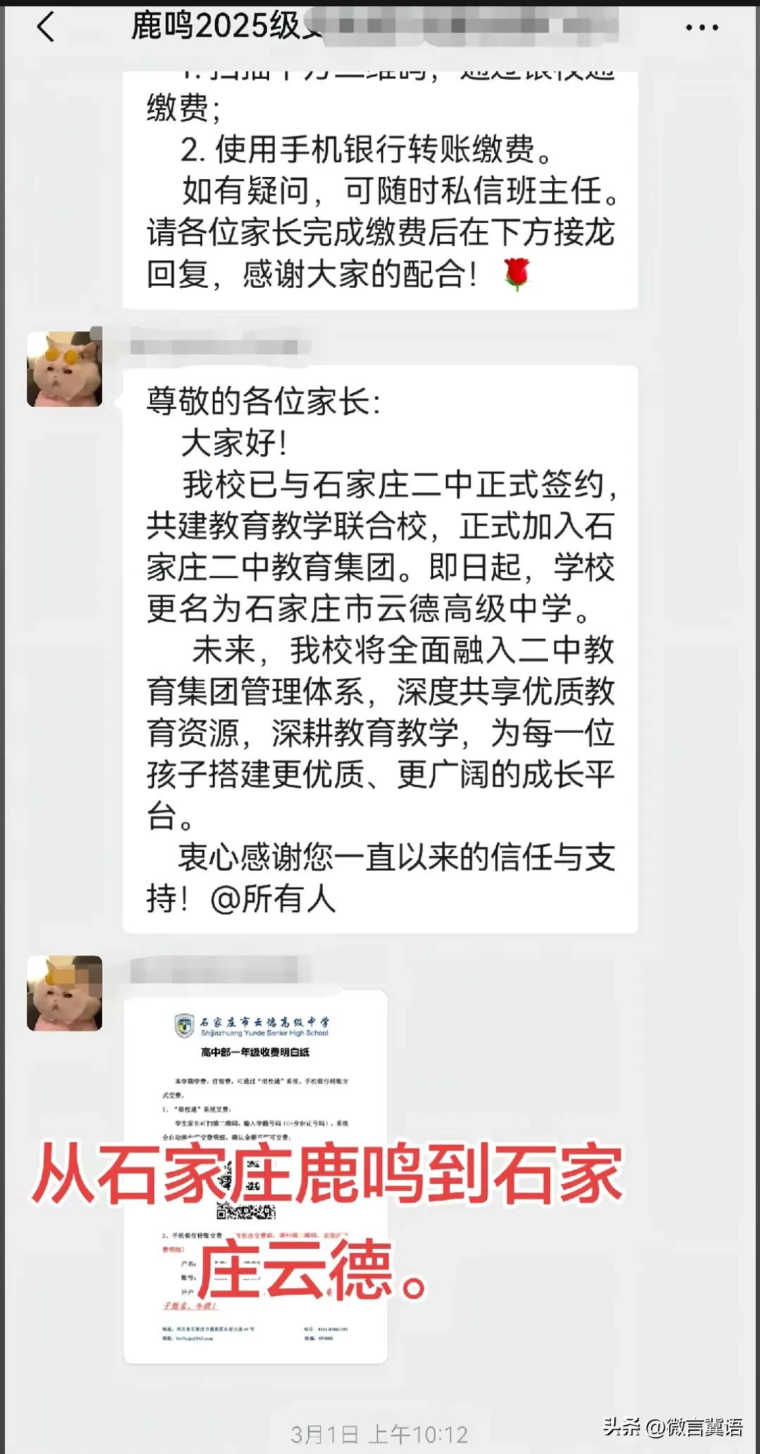 【石家庄二中,再下一城】刚刚开学,就收到炸裂的消息!石家庄鹿鸣学校,已经正式签约石家庄二中教育集团!改名叫石家庄市云德高级中学! 石家庄鹿鸣高级中学,位于石家庄鹿泉区!原来的名字应该叫石家庄凤凰外国语高级中学,后来改名叫石家庄鹿鸣高级中学!不管是原来起的名字,还是改的名字就非常高大上,确实是高端大气上档次!有贵族气质!原来听说学费是6万元,从学费上看也是名副其实的“贵族学校”! 怎么现在被“收编了”?石家庄二中这是真的“传帮带”啊!网友调侃道!原来的贵族学校,被石家庄王牌头部学校,石家庄二中教育集团的正规军给“收编”,纳入旗下!这是好事?还是迫不得已而为之? 网友问到:“6万学费降了吗?” 带定位晒今日生活 二中尚德校区 二中铭德校区 二中系学校 信息图片来源网络侵权联删