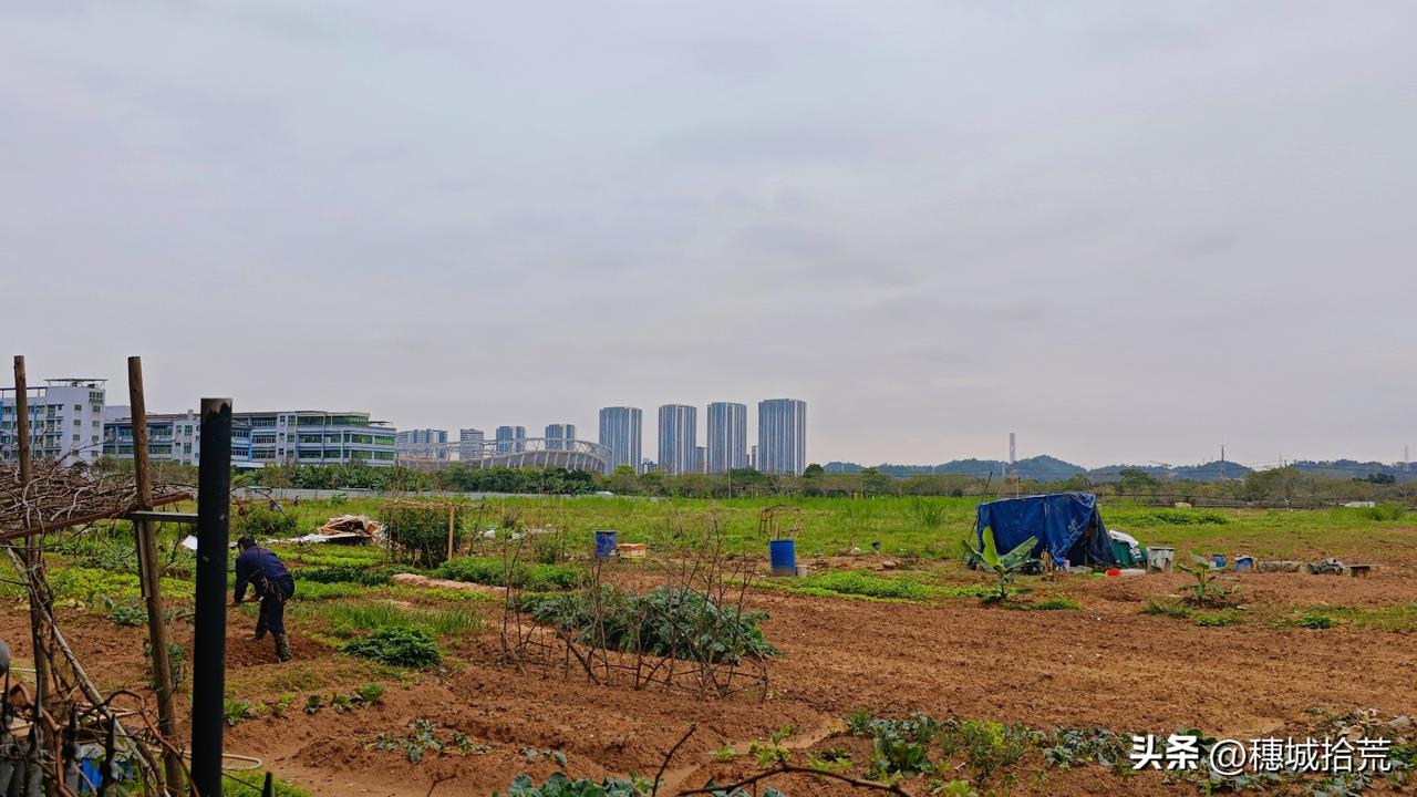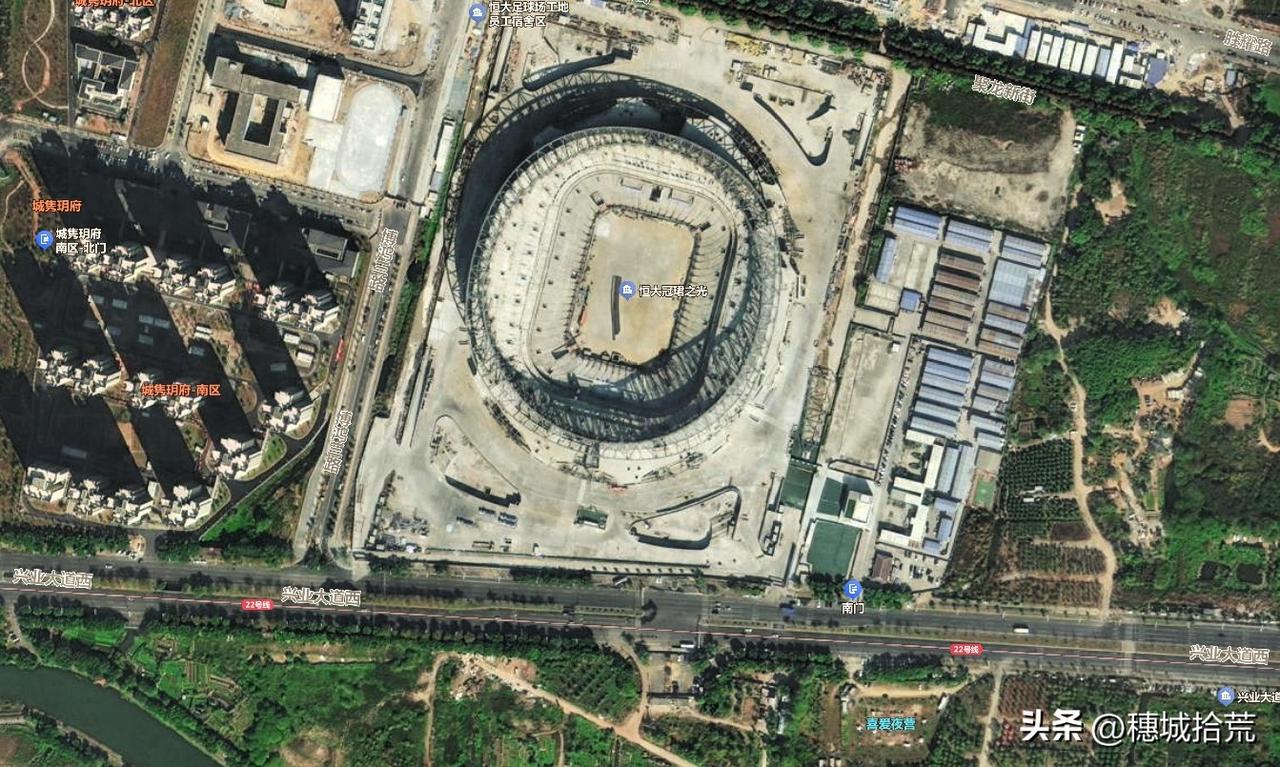 恒大球场的位置优越,靠近广州南站,今天过来附近办点事,在旁边的农田远远就能看到传说中恒大足球场,未能实现的世界第一。 如果恒大足球一直按照正常的节奏发展,现在的广州恒大足球场早已建成,规模将超越巴塞罗那坎普球场,登顶世界第一!眼前的这一片农田估计将不复存在,周边也会因足球起飞! 现实是,原计划2022年竣工的足球场,早因资金问题,止于2022年,此后土地退回,足球场更名“广州足球公园”。 喜欢中国足球的人,相信恒大足球场的事早有耳闻,然而网上关于球场的动态,真真假假,开开停停。今天在这里看到的情况,现在看来,进度不如人意。 倒是,球场后面的高楼,就是的配套房地产,房子早已建成封顶,就是不知道入住率如何。 历史没有重来,更没有如果,看着眼前的农田、远处未完工的恒大足球场,望洋兴叹,唏嘘不已。广州恒大 中国足球 恒大足球场 广州足球公园完工 广州身边事
