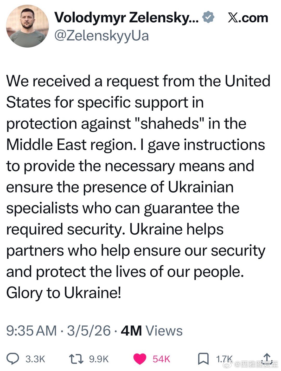 Zelensky:我收到美国请求,协助中东拦截伊朗无人机…我已派乌克兰专家,提供必要的支持…我们会帮助保障我们生命安全的盟友…荣耀属于乌克兰🇺🇦