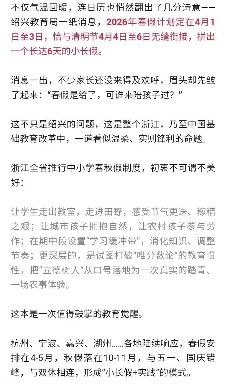 春假+清明连休6天,线路直接售罄!家长一边笑一边哭[捂脸] 今年假期太突然了!政府工作报告刚提支持中小学春秋假,成都、南京、苏州等地直接官宣:4月1日-3日春假+清明,直接凑出6天黄金长假! 消息一出,旅游圈直接爆单!数据太吓人:成都出发机票同比暴涨1.5倍,环比涨28%,成都直飞曼谷的线路全!部!售!罄! 三亚、北海、丽江更是一房难求,酒店加价、机票翻倍,有人说:这哪是放假,这是给钱包减肥! 孩子开心到飞起,家长却集体无奈: 孩子放假,大人不放假;想带娃出门,机票酒店贵到肉疼;不出门,又怕浪费这难得的春光。一边是政策暖心,一边是现实扎心,太难了! 不过话说回来,能有6天错峰长假,已经赢麻了!春暖花开,正是带娃看世界的好时候,哪怕周边走走,也比闷在家里强。政策是好政策,慢慢完善就更完美了! 你们那边放春假了吗?6天长假你打算带娃去哪玩?是出门旅游还是家里蹲?评论区聊聊! 春假清明6天长假 家长太难了 亲子游