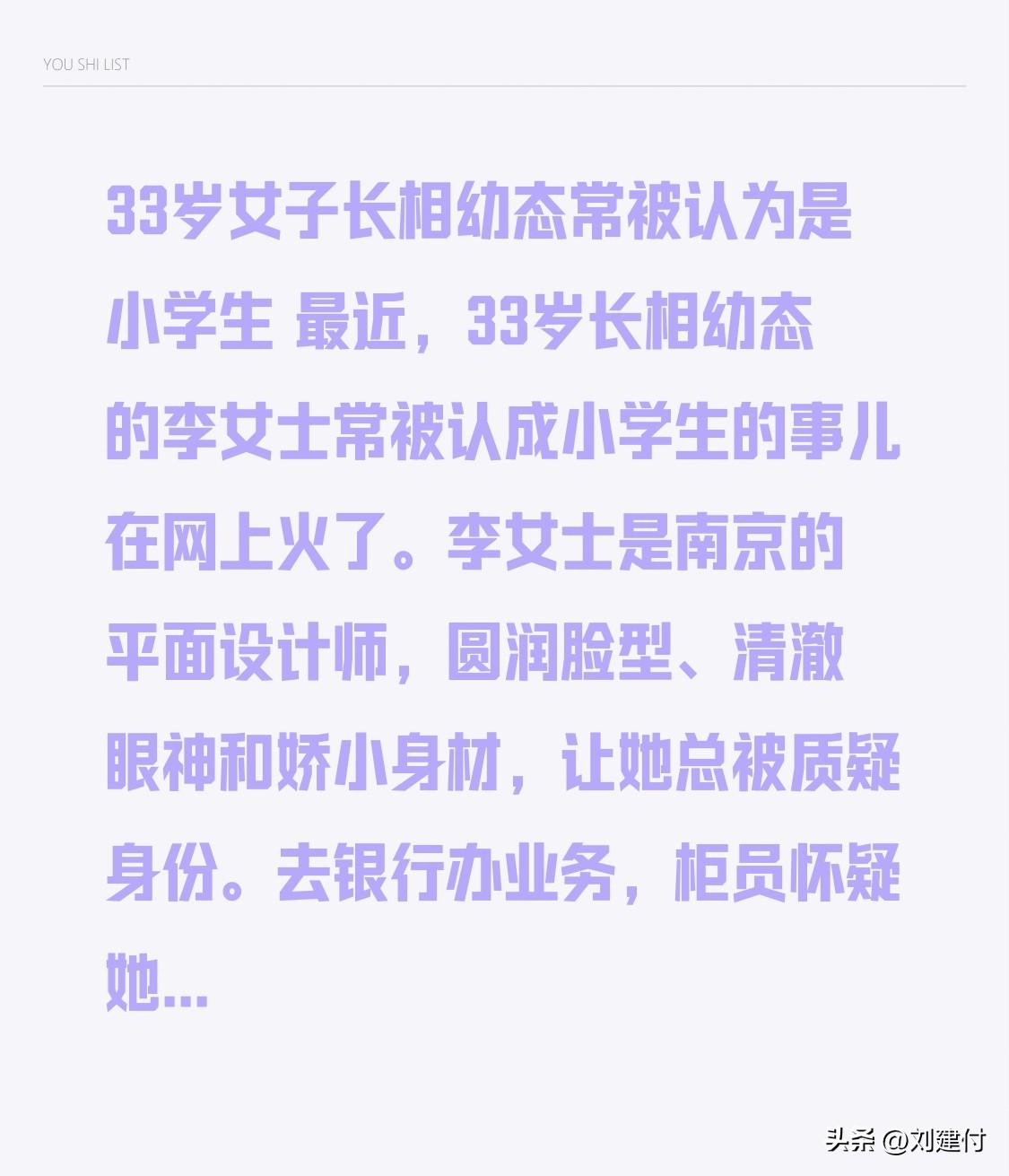 33岁女子长相幼态常被认为是小学生 33 岁女子长相幼态常被认成小学生 最近,33 岁长相幼态的南京平面设计师李女士,常被认成小学生一事在网上火了。圆润脸型、清澈眼神和娇小身材,让她总被质疑身份。 她去银行办业务,柜员怀疑她用假证;高铁验票、进网吧、买酒也麻烦不断。职场上,商务谈判时客户起初都不信她是负责人。这种误解已持续十年,开始她觉得好玩,后来只剩无奈。 这事儿反映出社会对“少女感”过度推崇,人们对年龄和外貌的关联认知太刻板,是时候打破审美枷锁了。