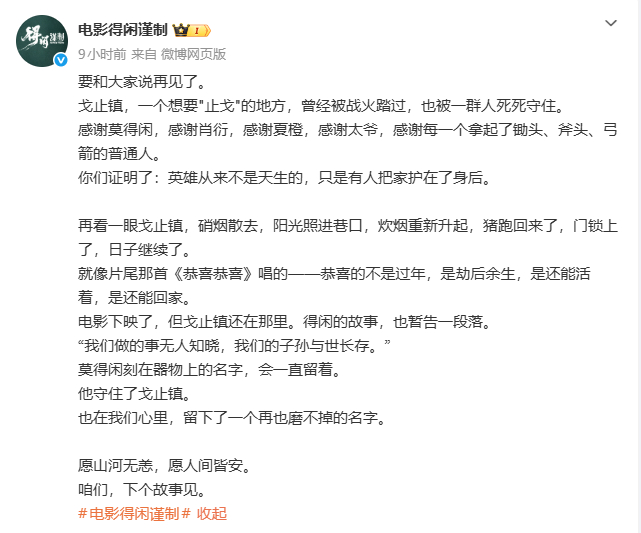 【得闲谨制今天下映】得闲的故事暂告一段落6日零点整,主演的发文:要和大家说再见了。“电影下映了,但戈止镇还在那里。得闲的故事,也暂告一段落……莫得闲刻在器物上的名字,会一直留着。他守住了戈止镇。也在我们心里,留下了一个再也磨不掉的名字。”电影《得闲谨制》由等主演,2025年12月6日正式上映,2026年2月4日,电影《得闲谨制》官宣密钥延期,映期延长至2026年3月5日。