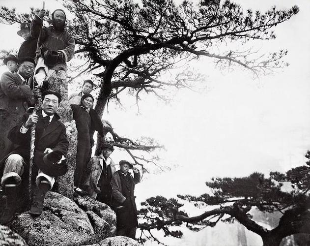 这张照片,记录了1936年春,中国近现代画坛的两位巨匠——徐悲鸿与张大千,在黄山之巅的一次巧遇。 照片左下方是时任南京中央大学艺术系教授徐悲鸿,正带领学生赴黄山写生,他身着西装,手持拐杖,是这次写生活动的组织者。照片左上方是张大千,当时受聘于中央大学,正与画家谢稚柳等人第三次游历黄山,他标志性的长髯和登山装束,在人群中十分醒目。照片中其他的人,是徐悲鸿带领的中央大学艺术系学生,以及张大千的随行友人。 1936年,张大千携谢稚柳游黄山,在山脚下恰好遇到了带领学生写生的徐悲鸿。两位大师欣然结伴同行,共同攀登险峰,在黄山的云海松涛间留下了这张合影。