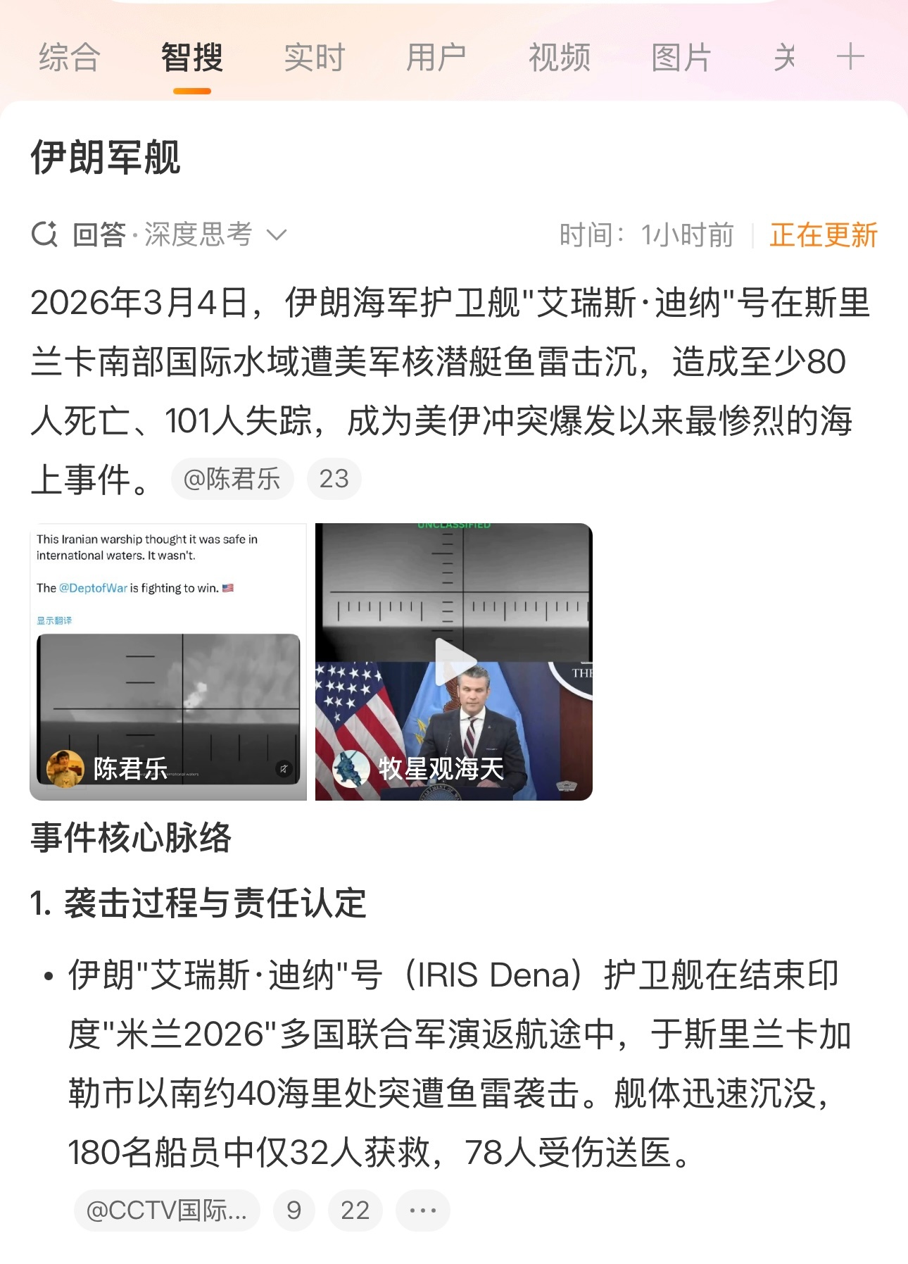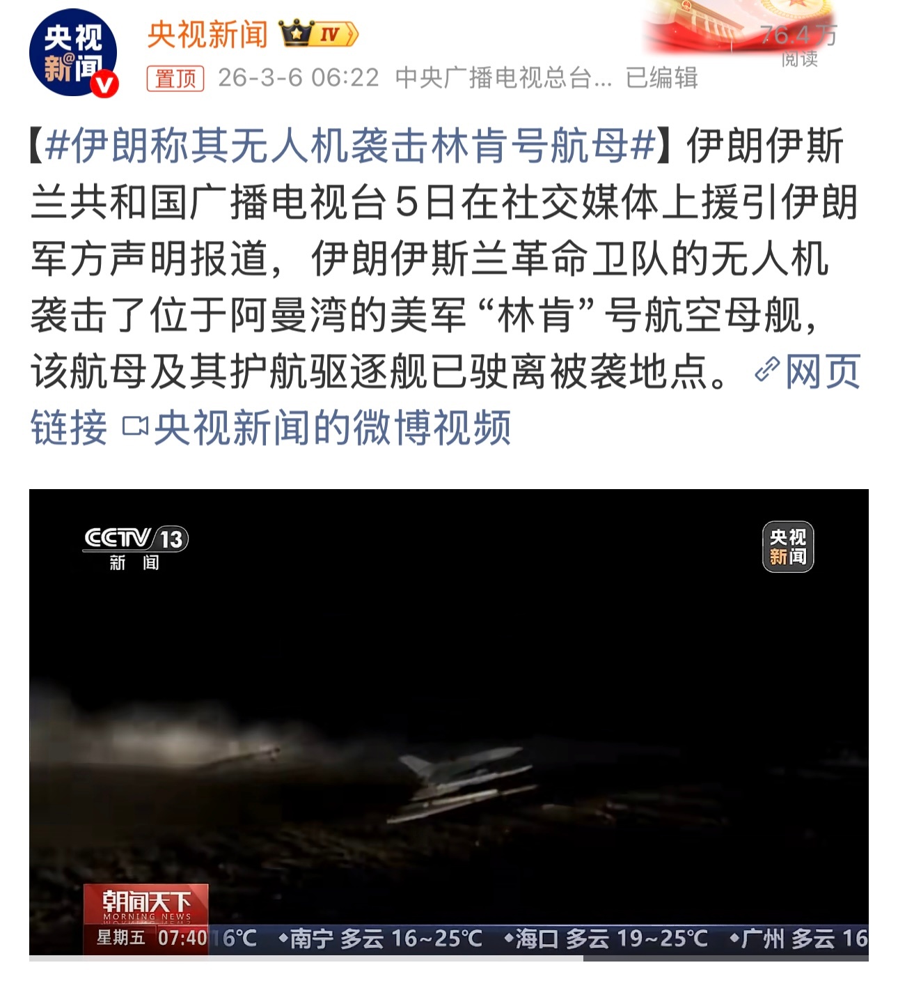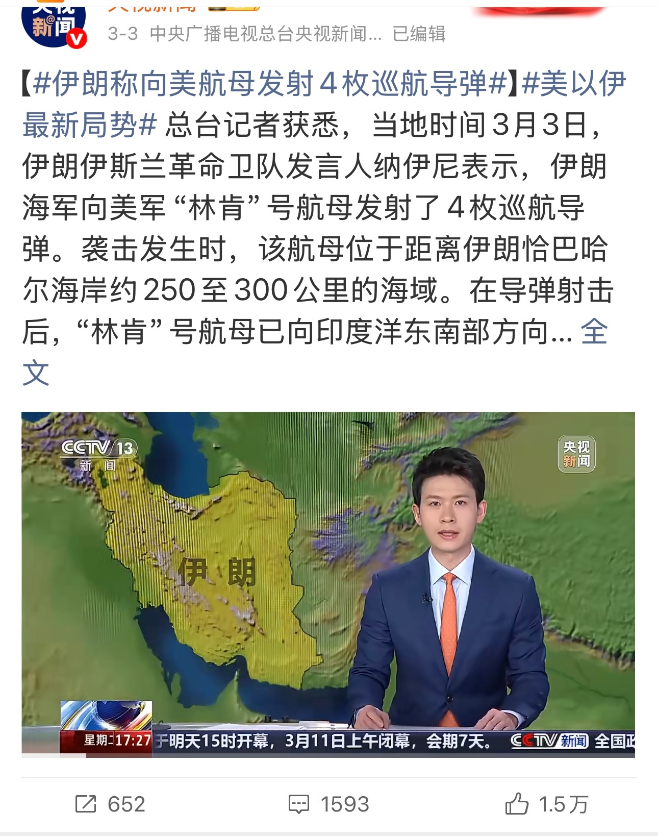 央视新闻报道:3月1日伊朗军方称伊朗用四枚弹道导弹袭击了美国林肯号航空母舰。3月3日伊朗又说用四枚巡航导弹袭击美军的林肯号航空母舰。3月6日伊朗又说用无人机袭击了林肯号航空母舰。三次袭击后,老美的林肯号航空母舰现在到底怎么样了。没受伤、受伤、重伤、危险。是哪一个选项。老美3月4日袭击伊朗军舰,是击沉,军舰里的人死了很多。