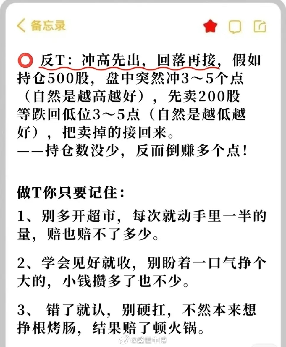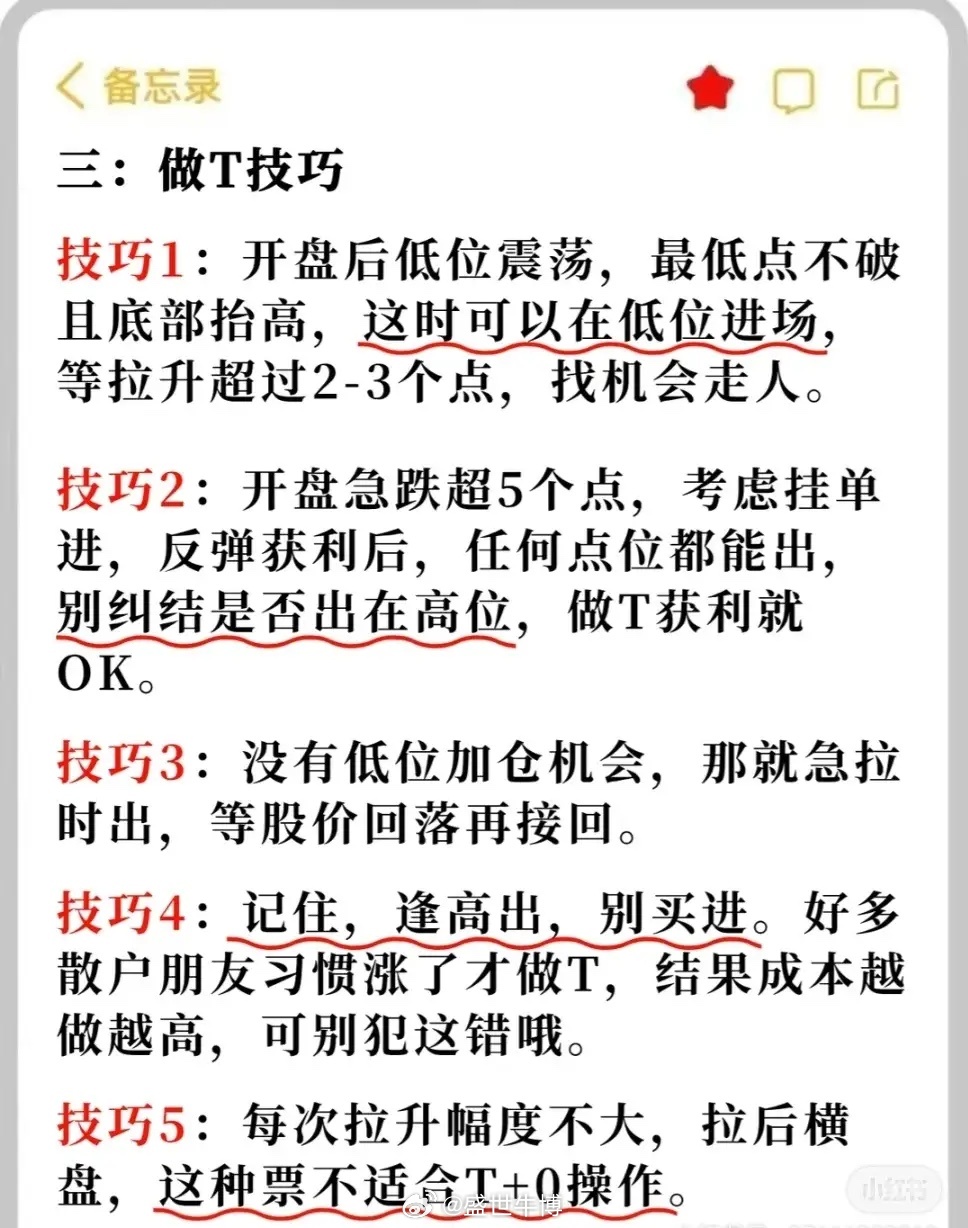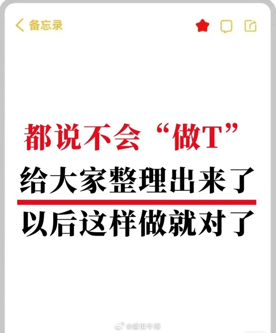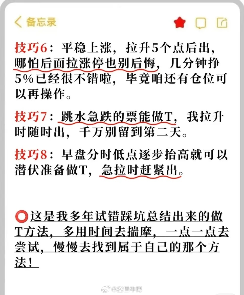 1. 做T方法:①正T:跌后补仓,涨后抛售(隔天操作),保持原股数赚差价;②反T:冲高先卖,回落接回,持仓不变获利。2. 黄金时间点:9:50 - 10:10高抛、10:10 - 10:40看数据持仓、11:10警惕诱多慎追、13:30 - 14:00观察、14:00 - 14:30游资拉抬、14:30 - 15:00(强市除外)防诱多。3. 做T技巧:开盘低位震荡、急跌超5点、急拉无低位机会、逢高出不买进、拉升幅度小横盘票不做、平稳上涨拉5点出、跳水急跌票急拉出、早盘低点抬高潜伏急拉出等。4. 注意事项:每次动一半仓位、见好就收、错了认赔不硬扛。