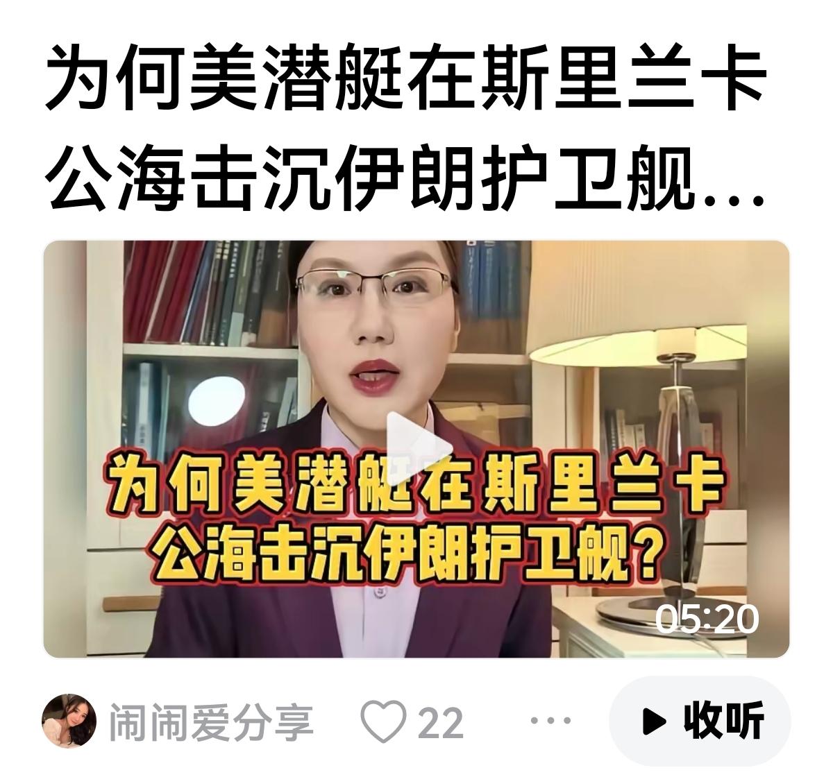 【这种解说等于没说】 听完这位教授的讲解,是乎感觉到美军潜艇对伊朗护卫舰突然袭击,是无中生有。 人家护卫舰前往印度邀请去参加演习,对毫无防卫的舰艇,美军发射鱼雷导弹击中目标。 不过这位教授有没有想到,伊朗高调宣布四枚导弹击中林肯号航母,封锁霍尔木兹海峡,这一切难道伊朗怒怼美国 不足以开火的理由吗?