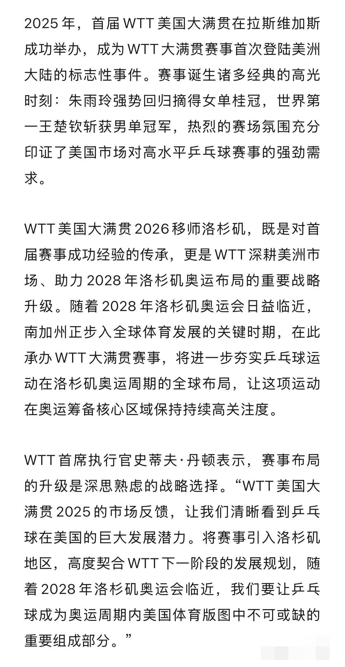 WTT美国大满贯2026落户洛杉矶 从里程碑式首秀,到助力2028 洛杉矶奥运会的布局, WTT美国大满贯2026正式落户 洛杉矶! 2025年美国大满贯在拉斯维加斯, 今年在洛杉矶举办, 也是助力洛杉矶奥运会, 提前熟悉一下环境! 2026洛杉矶大满贯将于 6月26日至7月5号在洛杉矶举办, 跟世界杯撞期,机票和酒店 一定很不好预定吧! 而且比赛场馆附近半个小时的路程 附近都没有好酒店, ontario附近太荒凉, 除了仓库之外还是仓库, ontario mills周围也没有任何 可以逛到的景点, 也就是说,比赛场馆不在 洛杉矶市中心, 大概去不了吧!