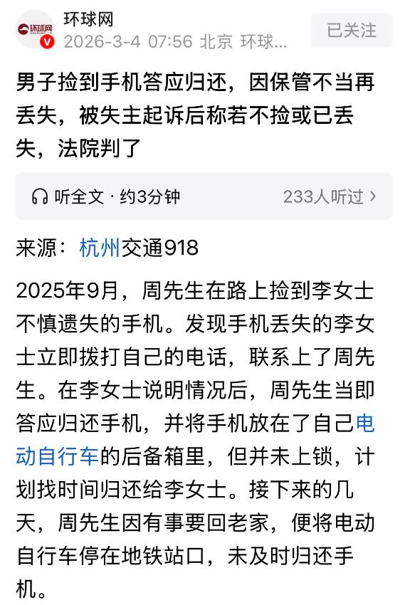 北京,男子走路上捡到一部手机,失主着急打来电话恳求归还,男子爽快答应,并把手机放进电动车后备箱保管,因为男子有事要回老家一趟,他就把车停在地铁口,准备找个时间还给失主,然而,他走时忘记给后备厢上锁,等到还时,发现手机已经不见踪影,这下失主不干了,直接诉至法院,要求男子赔偿手机费、误工费、交通费和信息损失费,结局让男子傻眼。 这件事发生在2025年9月,看似一件不起眼的小事,却牵扯出一场法律纠纷,也给很多人提了个醒。 当时男子走在路边,无意间发现脚边有部还亮着屏的智能手机,看得出来是刚丢失没多久,他随手捡起来,还没来得及仔细查看手机里的联系方式,手机就急促地响了起来。 电话那头是失主,语气里满是焦急,反复恳求男子能把手机归还,说里面有重要的工作信息和联系人,还有不少没备份的照片,男子本就是个热心人,没多想就一口答应下来,想着先找个地方妥善保管,再和失主约时间交接。 因为当时男子家里突然有急事,需要立刻回老家一趟,根本没时间当场和失主碰面。 他便把手机放进了自己电动自行车的后备箱,想着等从老家回来,就第一时间联系失主归还。 匆忙之间,他忘了给后备箱上锁,只是随手扣了一下,便急急忙忙把电动车停在地铁口,转身就赶去坐车,完全没意识到这个疏忽会给自己带来麻烦。 等男子从老家赶回来,想起归还手机的事,急匆匆赶到地铁口找到自己的电动车,打开后备箱时,整个人都愣了——里面的手机早已不见踪影。 他赶紧四处打听,询问周边的路人,查看附近的监控,可折腾了大半天,还是没能找到手机的下落。 男子心里也很着急,毕竟自己答应了失主,如今手机丢了,他也觉得很过意不去,主动联系失主说明了情况,想着和对方好好协商。 可失主得知手机丢失的消息后,当场就翻了脸,根本不听男子的解释。 他认为是男子没有妥善保管,才导致手机再次丢失,要求男子赔偿自己的全部损失,包括手机购买费用、因寻找手机耽误工作产生的误工费、来回奔波的交通费,还有手机里信息丢失造成的损失。 男子觉得很委屈,自己好心捡手机,没有占为己有,只是一时疏忽忘了上锁,怎么就成了自己的全责,双方各执一词,协商了好几次都没能达成一致。 见协商无果,失主直接一纸诉状,将男子诉至法院,要求其赔偿所有提出的损失,男子接到法院传票时,还抱有一丝侥幸,觉得自己是做好事,顶多道个歉,不至于要赔偿。 可法院审理后认为,男子拾得遗失物并答应归还,就有义务妥善保管,他将手机放在未上锁的电动车后备箱,无人看管,存在明显过失,正是这个过失导致手机丢失,应当承担赔偿责任。 不过法院也明确说明,失主主张的误工费、交通费和信息损失费,并非法定的获赔项目,不能得到支持,最终在法院的调解下,双方达成一致,男子当庭向失主赔偿了手机折旧后的金额,这场因捡手机引发的纠纷才得以解决。 男子拿着赔偿单据,心里满是无奈,原本的好心之举,最后却要自己掏钱买单,也让他彻底明白,拾金不昧不仅是道德要求,更是法律义务,保管不当,好心也会惹祸上身。