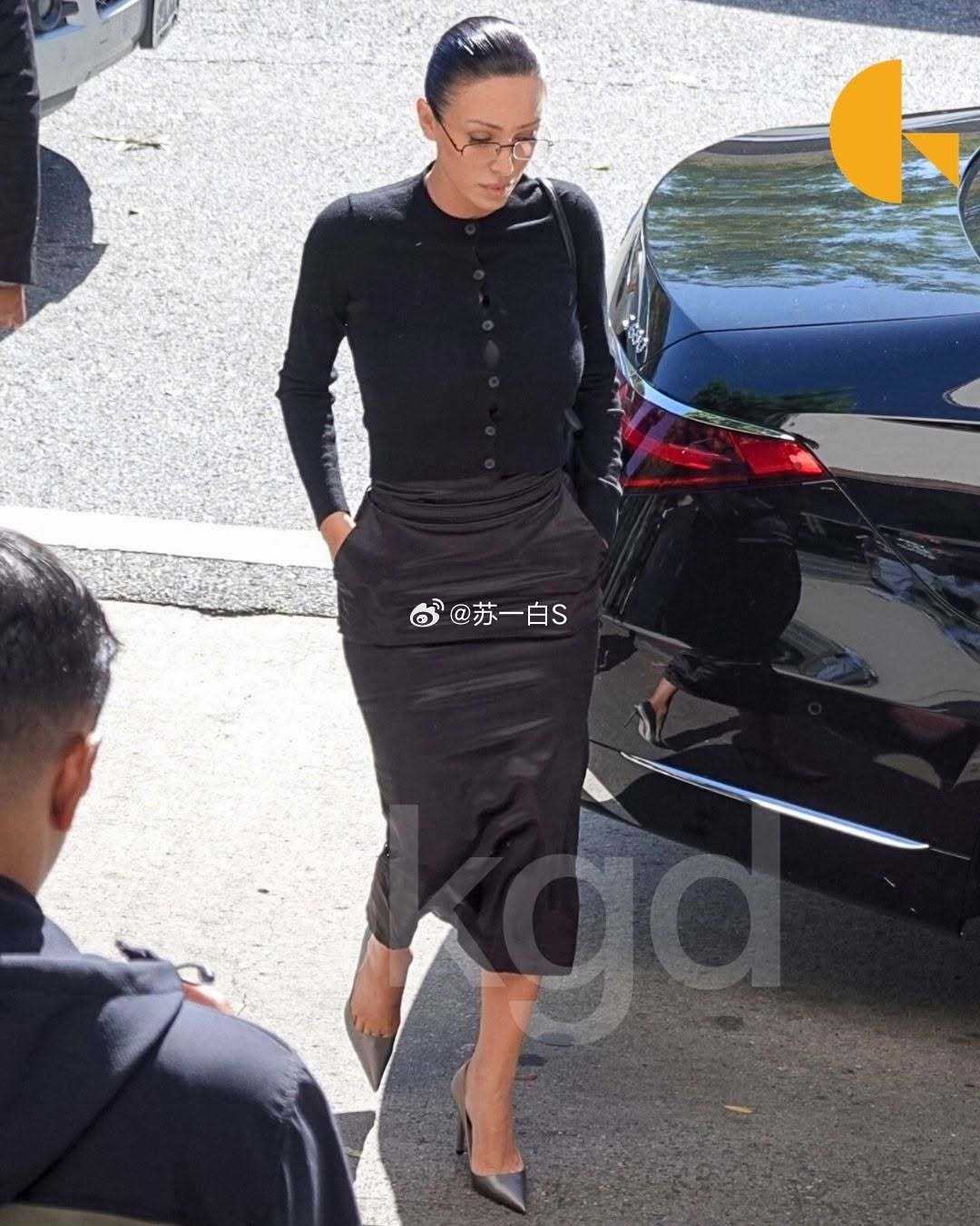 自她走红后从未见过的穿搭——一件扣得严严实实的黑色长袖上衣,下搭一条黑色长裙,还戴了一副眼镜‼️