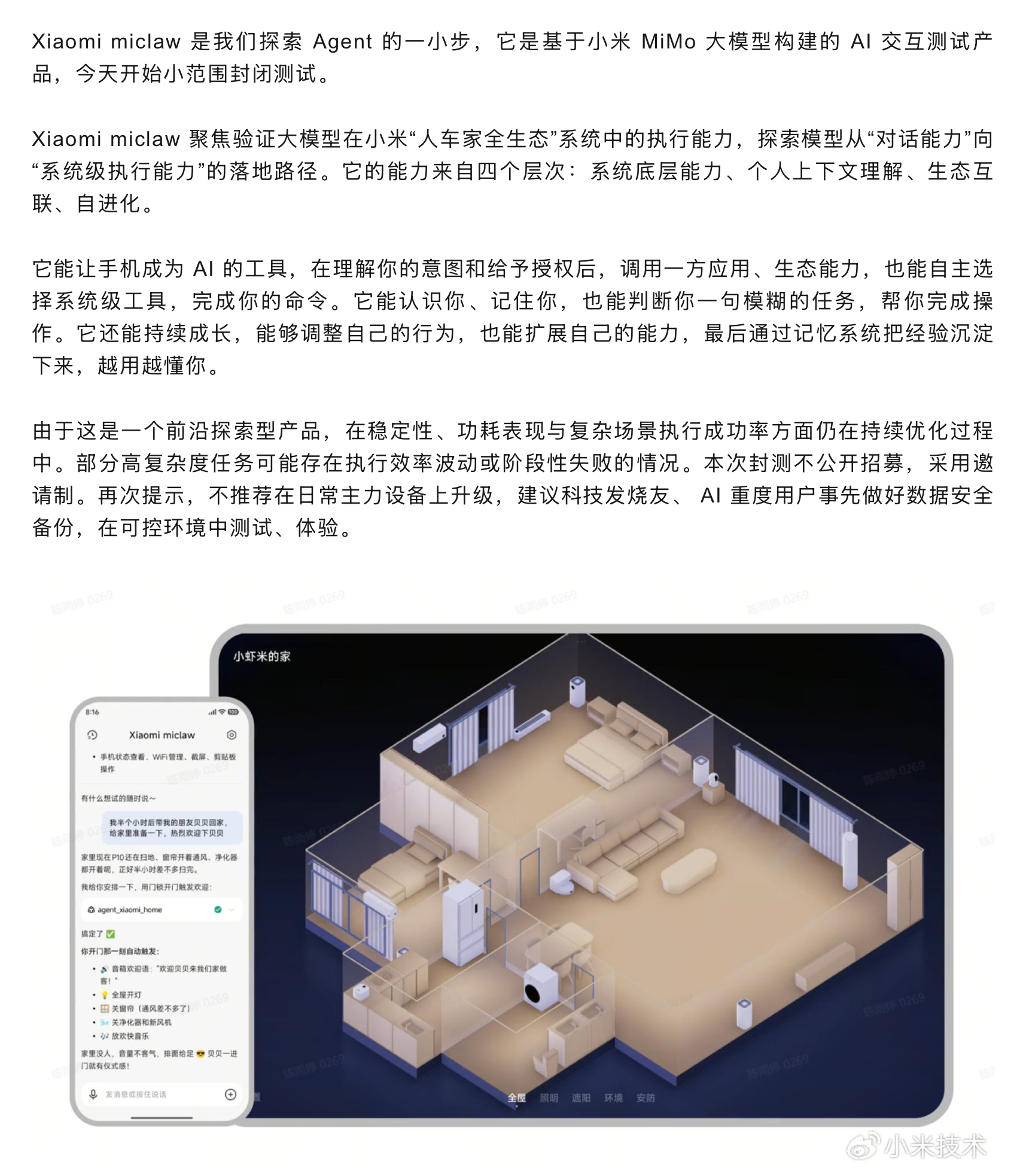 最近Openclaw是非常火,而这会小米手机版龙虾来了 ,miclaw开始小范围封闭测试。对于Agent的进一步探索,手机上的“自动驾驶”,也越来越近了。伴随着模型的更多数据训练、完善,AI更强,后续也会逐渐实现更多的操作。能够更准确理解意图,能够帮助你完成更多的操作。不过这次的封测是不公开招募的,采用邀请机制。目前支持的机型是小米17系列。你期待么?