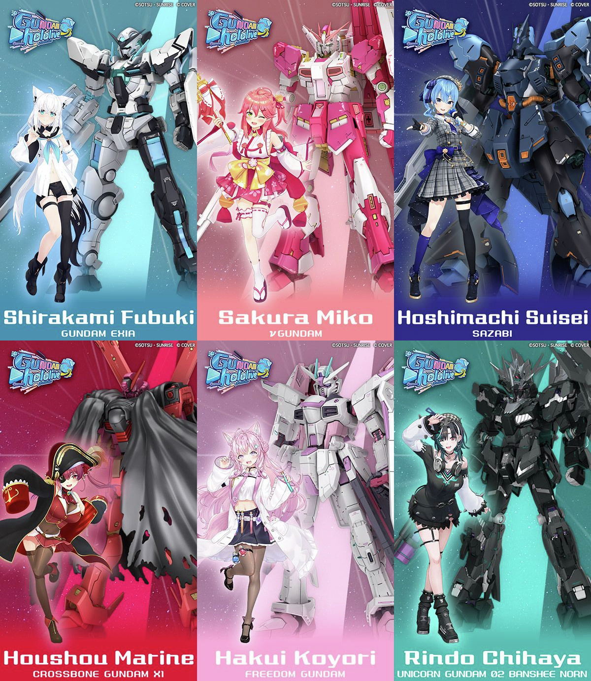 高达×hololive联动企划:原创配色高达模型第一弹——高达 高达能天使【白上フブキ Ver.】🌽ν高达【さくらみこ Ver.】🌸沙扎比【星街すいせい Ver.】☄️海盗高达X1【宝鐘マリン Ver.】🏴☠️自由高达【博衣こより Ver.】🧪独角兽高达2号机报丧女妖·命运女神【輪堂千速 Ver.】🎧🔧