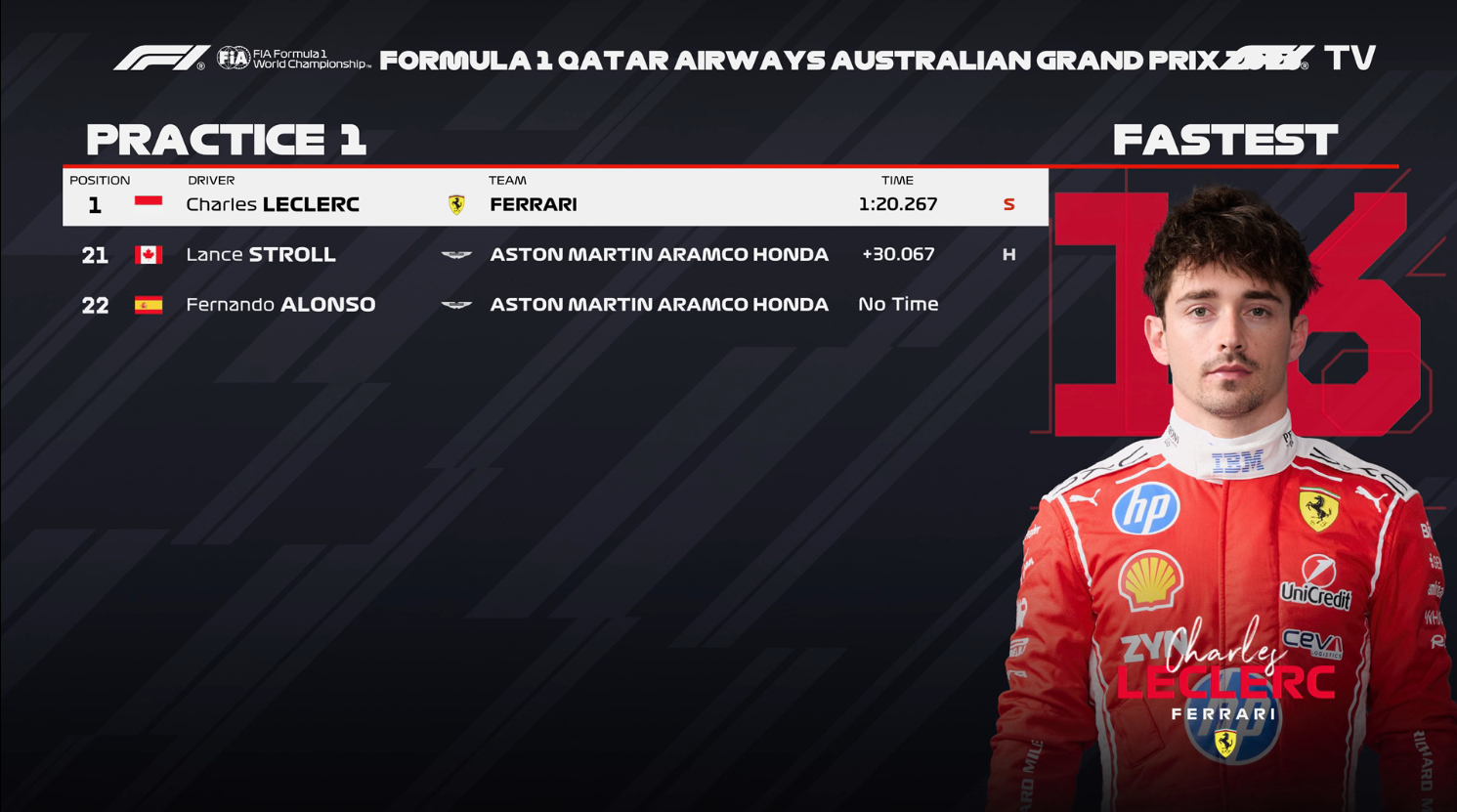 F1澳大利亚大奖赛FP1成绩:法拉利包揽1-2,维斯塔潘P3