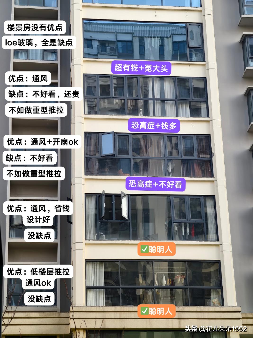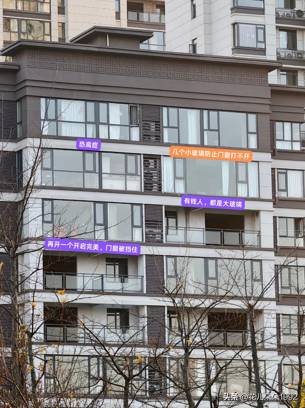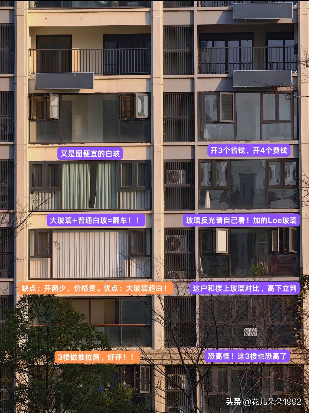 邻居窗户,性价比的不多啊! 封窗的样式,也影响价格,发现大家还是花了很多冤枉钱。 图一和图二,我自己小区。非江景房 图三和图四,周末回老家县城的小区。湖景房 开评~~~ 图一,两户聪明人,两户冤大头 ①开启不是越多越好,想要通风,低楼层直接重型落地推拉窗得了。 12平的封窗,开4个开启扇,刚刚好,不浪费开启,加大通风面积。 ②没必要做大玻璃,大玻璃真的费钱,还费吊装。加的lowe玻璃,还影响视线。 PS:江景、湖景房可以大玻璃 ③横杠别多,虽然恐高的不怕,但也就是心里作用。 图二是小户型,10平封窗开3个开启刚好 ④如果做了大玻璃,就请做超白玻,做个白玻发绿,一样不好看。 ⑤三楼做的落地推拉窗,好评。通风好,不临街,也不吵 图三 ⑥室内会做洗衣池的地方,开启扇别挡住了