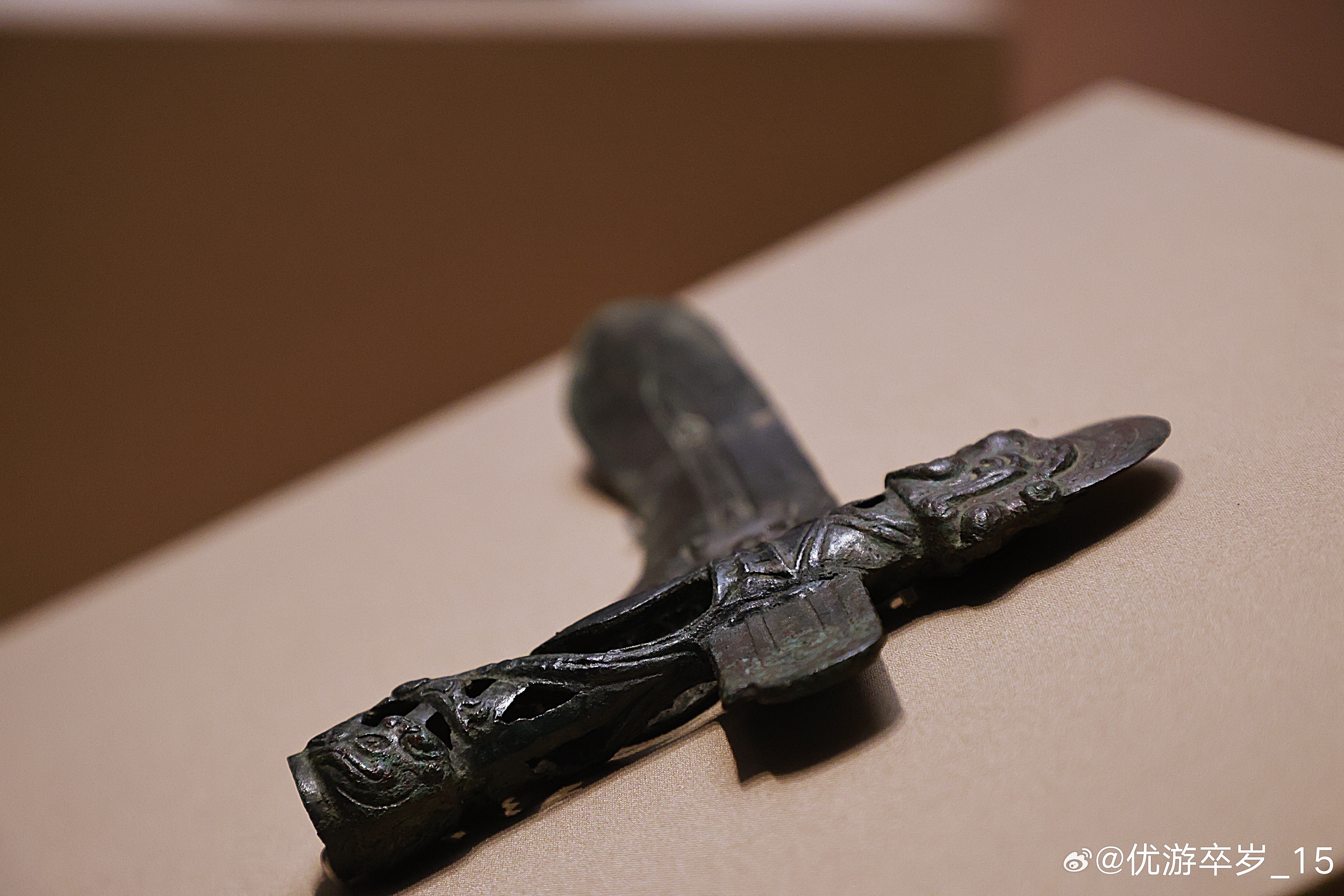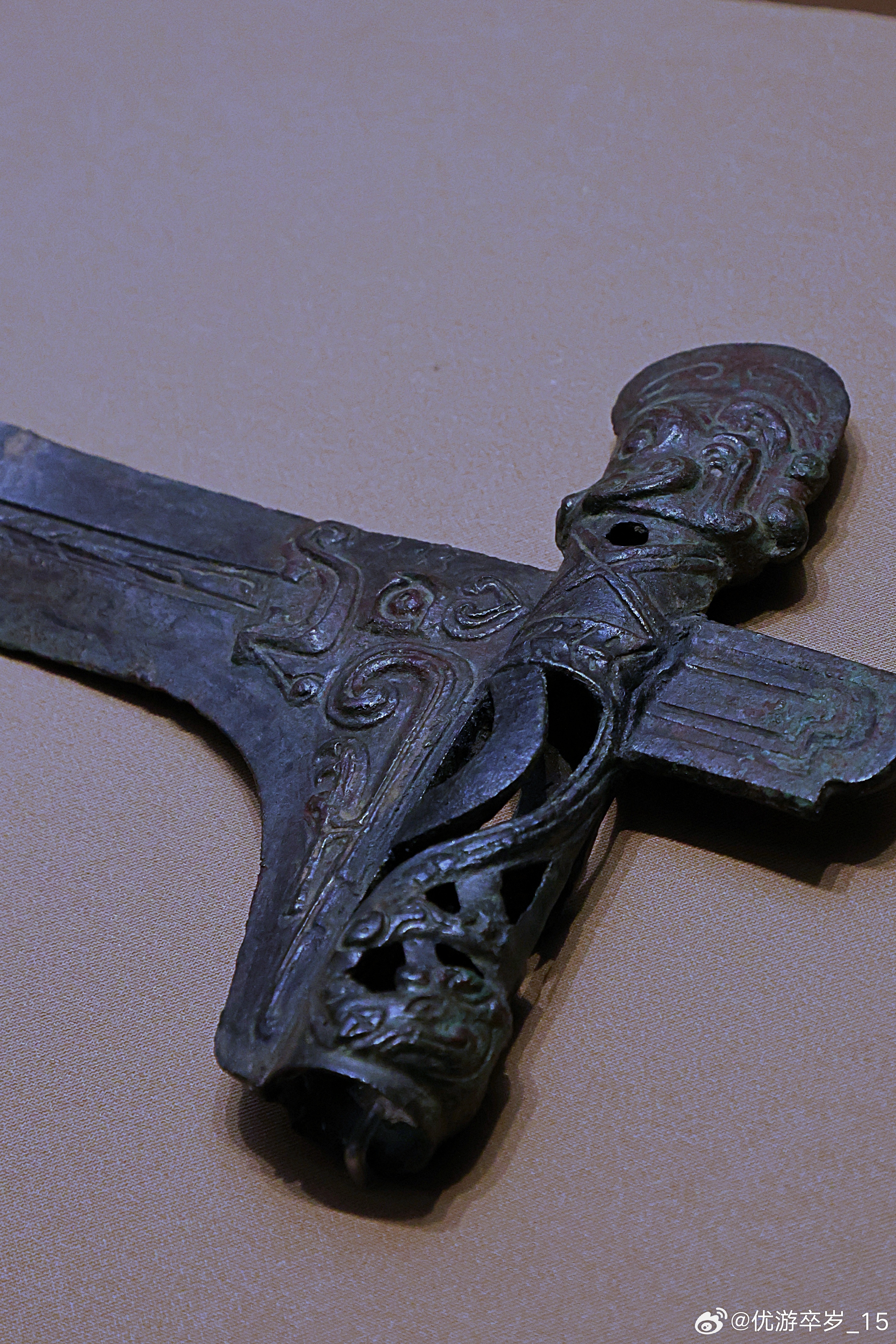 我的2026 【中国之中-中原古代文明精粹】 铜戈西周(公元前1046-前771年)洛阳博物馆藏1964年洛阳北窑庞家沟出土。这柄铜戈,通体黝深,光泽沉郁。銎孔顶端圆雕高冠人首,下方镂空抽象人身。援部装饰猛虎,凸目圆睁,巨口贲张,口中吐出的的长舌被设计为实用的血槽。此戈纹饰诡异、工艺精湛,很有可能属于与周王室关系密切的高级贵族。清华大学艺术博物馆展出2026.2.8约会博物馆文物