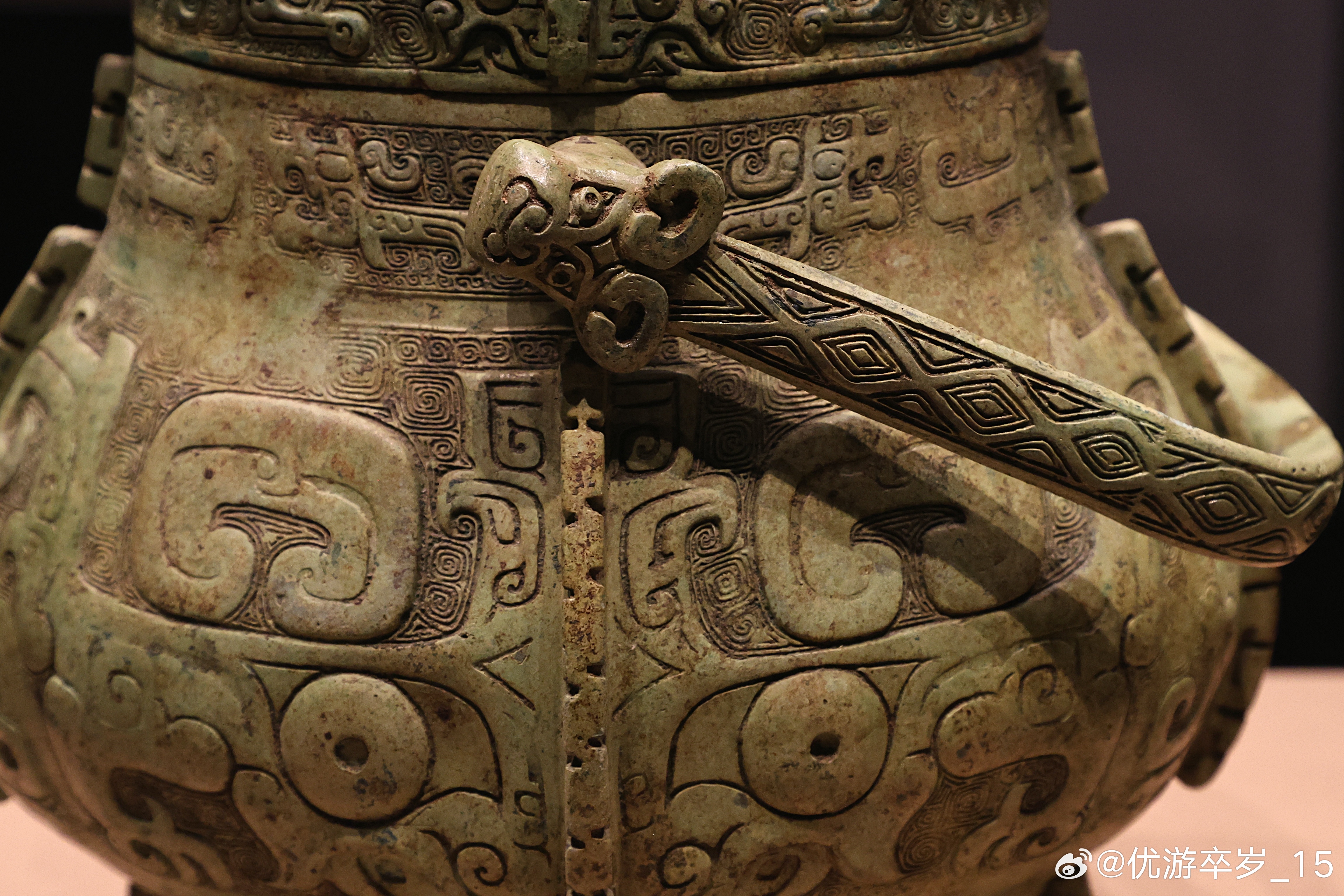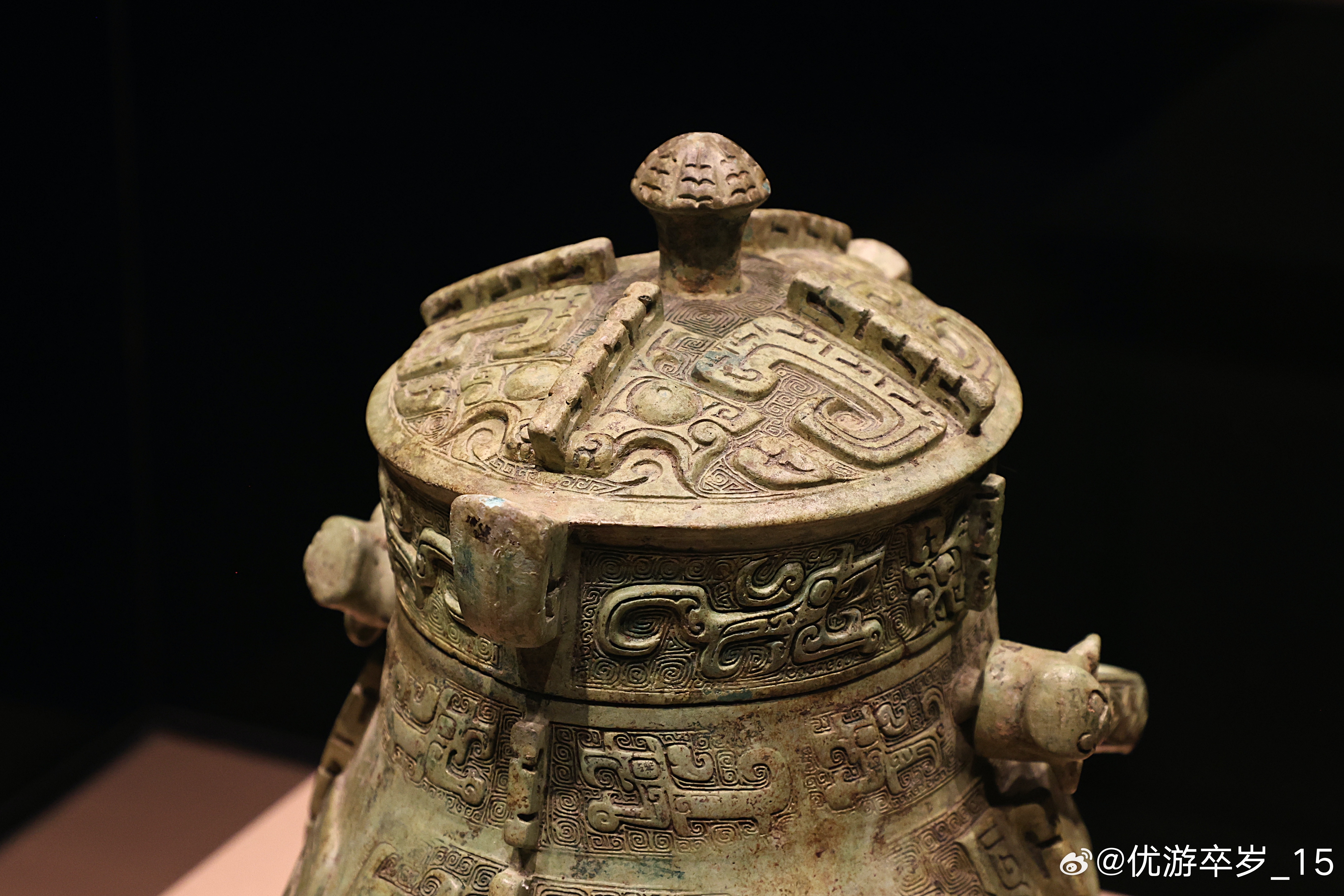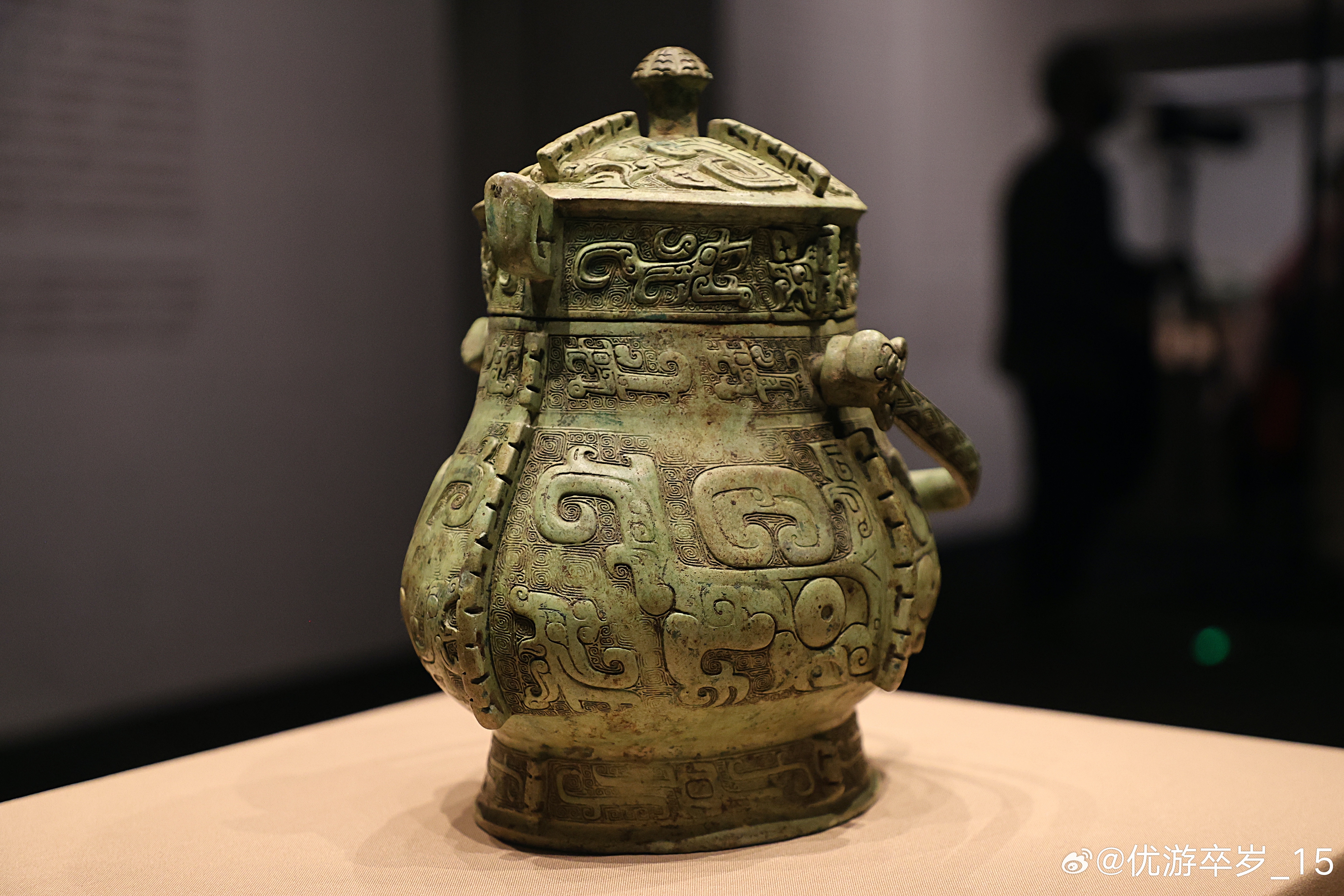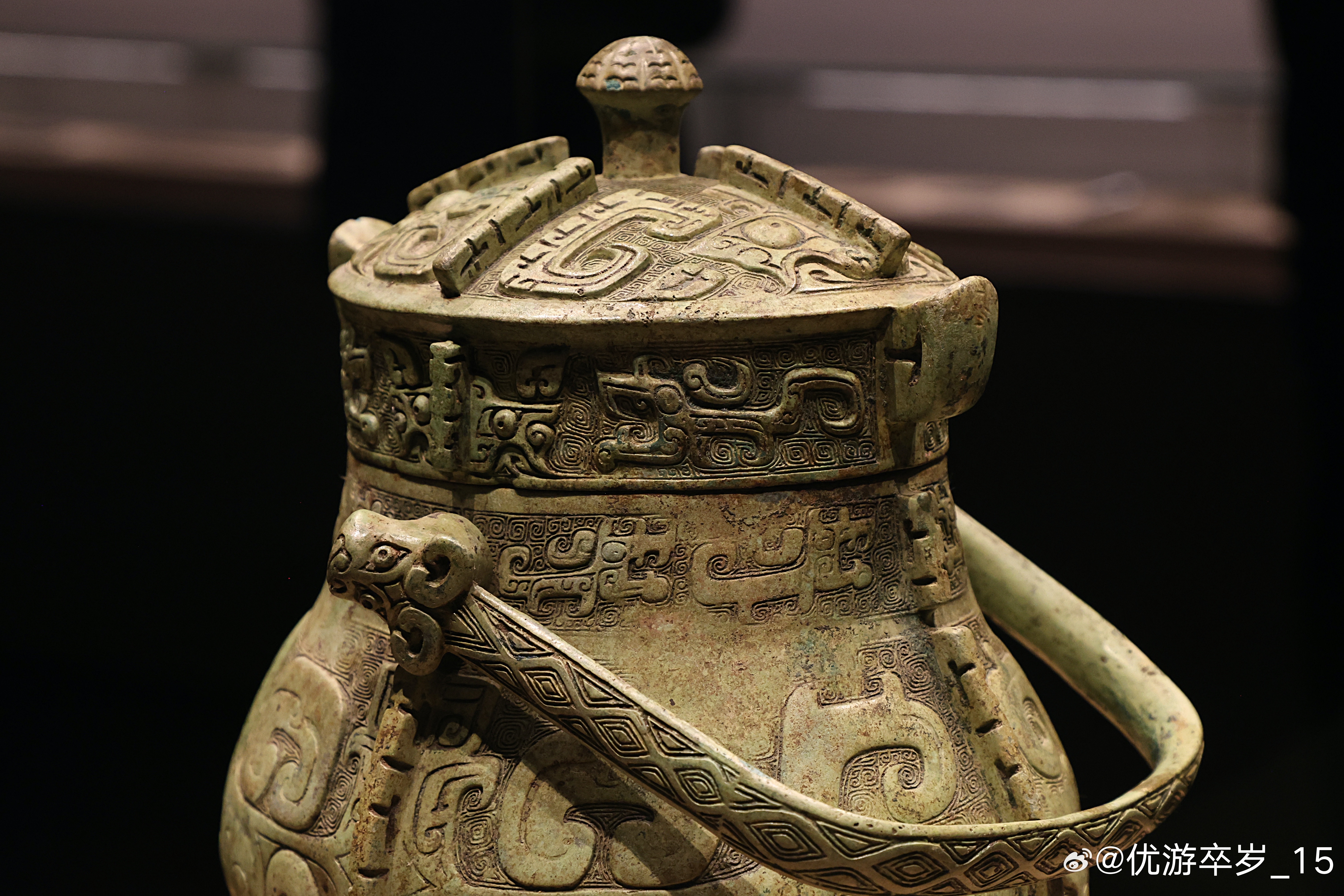 我的2026 【中国之中-中原古代文明精粹】 铜提梁卣商(公元前1600-前1046年)河南省文物考古研究院藏罗山天湖墓地出土。器身作敛口,短颈,鼓腹下垂,轮廓饱满而富有张力,下承高圈足,挺拔而立。盖呈穹窿状,口沿起檐,檐下饰高裙,顶立八瓣花蕾形钮,花瓣之上细刻蝉纹,盖与器身以子母口严丝合缝。提梁纵置,两端铸为兽首,衔接颈部半环耳,梁身饰纽索纹。器身四隅与四面中线皆饰挺拔的勾形扉棱,棱脊经长年使用,可见明显磨损痕,这并非残缺,而是礼仪生活中反复提取、移动所留的印记。通体纹饰繁密而有序,以细密云雷纹为地,盖顶与器腹饰兽面纹,双目凸起。盖群、颈部及圈足环饰夔龙纹。清华大学艺术博物馆展出2026.2.8约会博物馆 文物