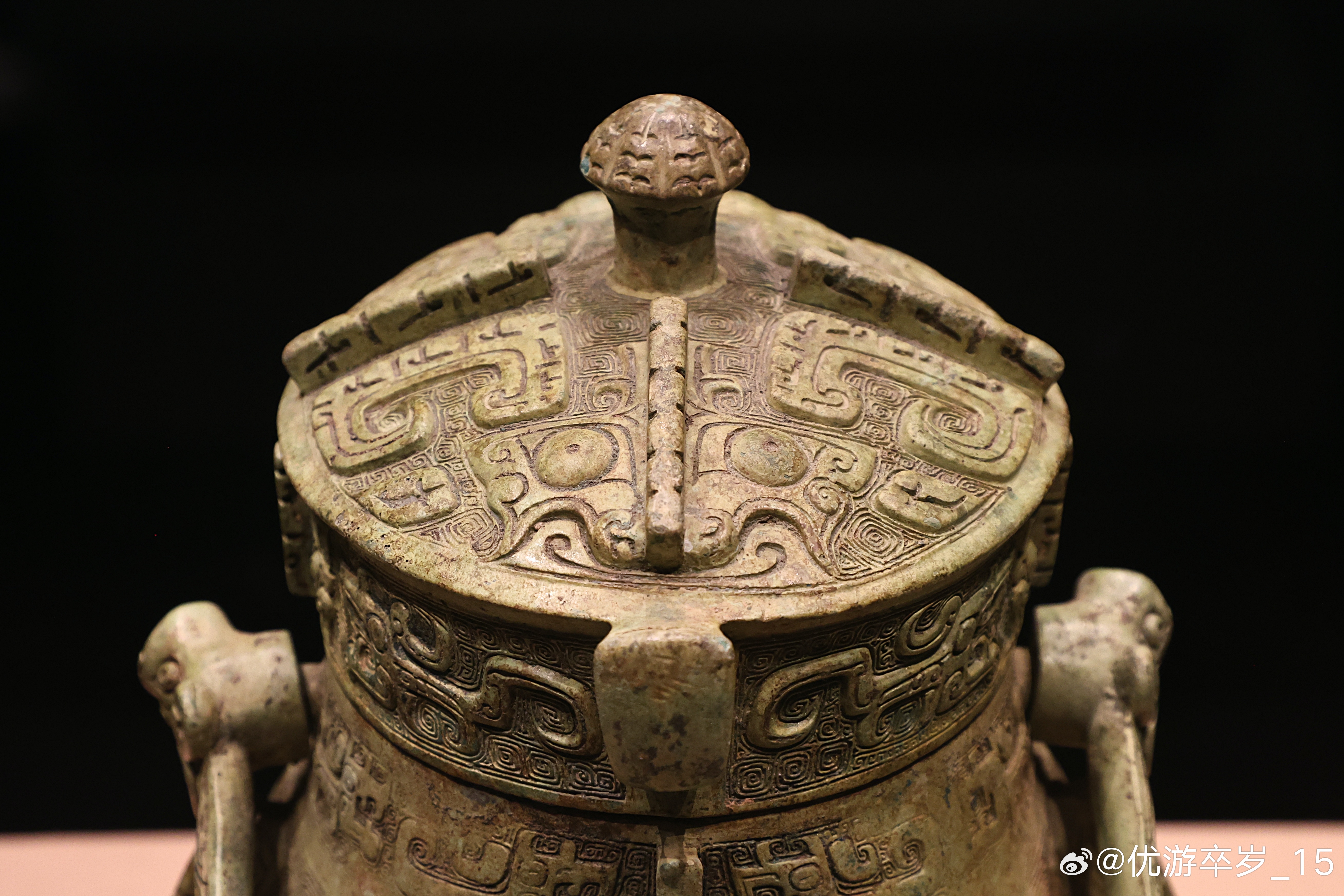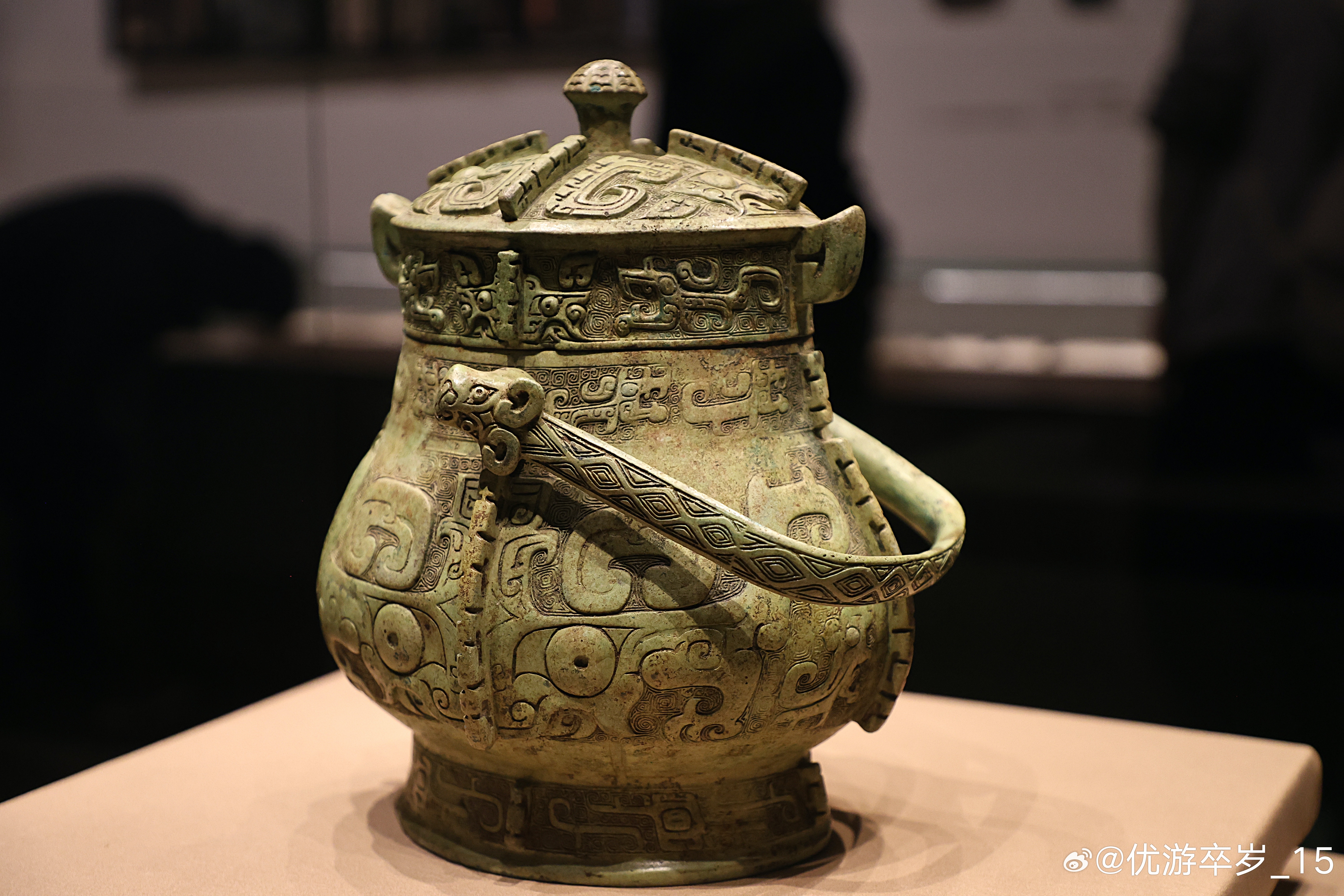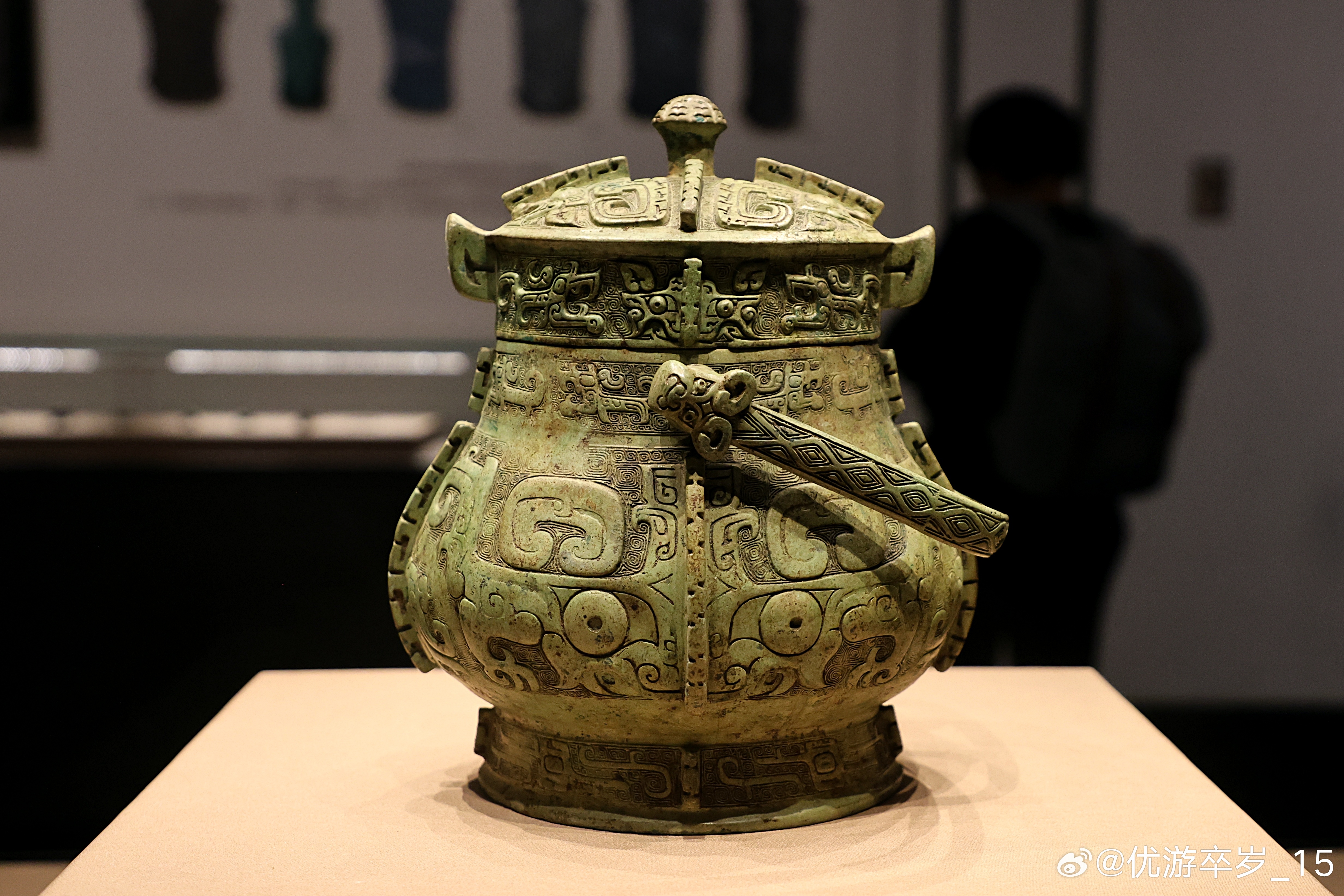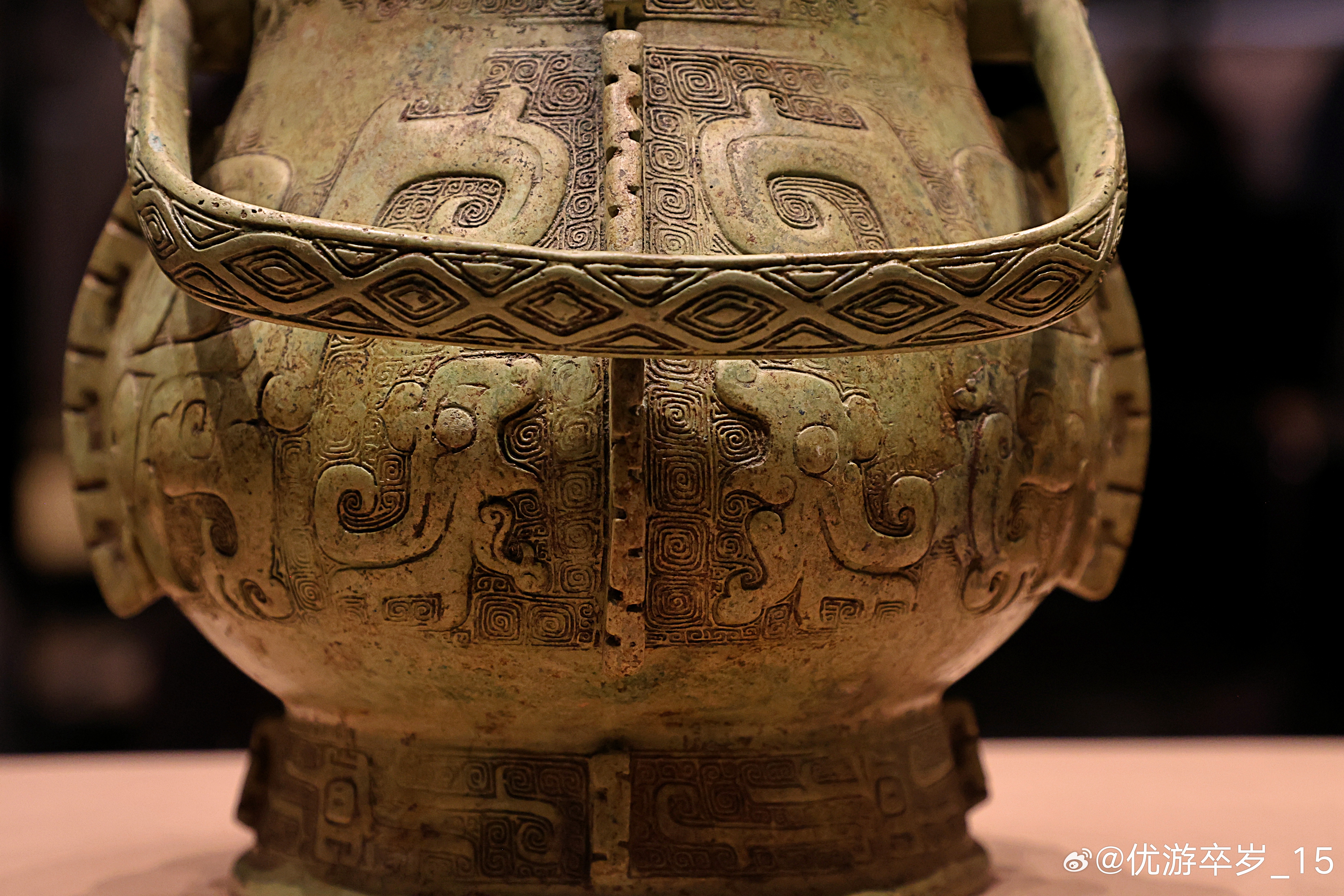 我的2026 【中国之中-中原古代文明精粹】 铜提梁卣商(公元前1600-前1046年)河南省文物考古研究院藏罗山天湖墓地出土。器身作敛口,短颈,鼓腹下垂,轮廓饱满而富有张力,下承高圈足,挺拔而立。盖呈穹窿状,口沿起檐,檐下饰高裙,顶立八瓣花蕾形钮,花瓣之上细刻蝉纹,盖与器身以子母口严丝合缝。提梁纵置,两端铸为兽首,衔接颈部半环耳,梁身饰纽索纹。器身四隅与四面中线皆饰挺拔的勾形扉棱,棱脊经长年使用,可见明显磨损痕,这并非残缺,而是礼仪生活中反复提取、移动所留的印记。通体纹饰繁密而有序,以细密云雷纹为地,盖顶与器腹饰兽面纹,双目凸起。盖群、颈部及圈足环饰夔龙纹。清华大学艺术博物馆展出2026.2.8约会博物馆 文物