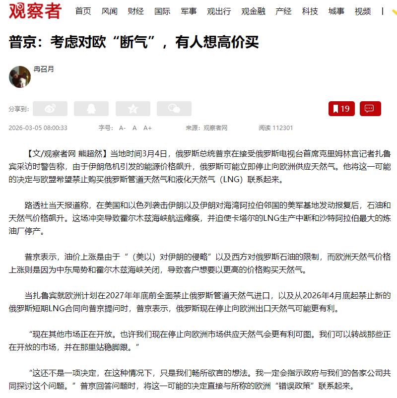 路透社3月5日报道:“普京总统警告称,受伊朗危机引发的能源价格飙升影响,俄罗斯现在就可以暂停对欧洲的天然气供应。他将这一可能举措与欧盟欲禁止购买俄罗斯天然气及液化天然气(LNG)的想法联系在了一起。” 很多人不明白,欧盟都要禁购了,普京为啥还要主动提前停供?其实这不是一时生气,背后都是为了自己国家的利益。 先说说欧盟的打算,他们已经通过法律了,计划2027年彻底不让买俄罗斯天然气,不管是工厂用还是老百姓取暖用,都不行。 从2022年俄乌冲突开始,欧盟就慢慢少买俄罗斯天然气了,到2025年底,已经从之前的近一半降到了13%,但还是铁了心要在2027年彻底切断合作。 再讲能源价格为啥涨这么快,这和中东的伊朗危机有关。2026年2月底,美国和伊朗闹得越来越凶,伊朗不让船过霍尔木兹海峡,这个海峡是全球运能源的关键通道,很多天然气都从这过。 后来又有油轮被袭击,航运公司停了航线,天然气不够了,价格就疯涨,欧洲天然气一周就涨了75%,这种高价还得持续几个月,这就是普京说的好时机。 说白了,普京要提前停供,就是不想等着被欧盟制裁,要自己掌握主动权。要是等到2027年欧盟单方面禁购,俄罗斯的天然气再找其他买家,就卖不上好价钱了,损失就大了——能源出口是俄罗斯的主要收入,天然气更是重要来源。 现在价格这么高,提前停供对俄罗斯有两个好处。一是能多赚钱,既然欧洲迟早不买,不如趁现在价格高,把要卖给欧洲的天然气,转给中国、印度这些愿意出高价的国家。 俄罗斯早就开始往亚洲卖天然气了,就算不卖给欧洲,也能卖出去,还能多赚一笔。 二是能教训一下欧盟,让他们尝尝能源不够的滋味。有人觉得,欧盟已经少买俄气了,停供也没关系,其实不是这样。 虽然现在俄气只占欧盟进口的13%,但欧洲天然气库存特别低,能替代的来源也少,挪威、美国、卡塔尔都没法多供。 真停供了,欧洲天然气价格会更贵,老百姓电费、取暖费涨,工厂也可能停产,要是冬天来了,欧盟可能还得回头找俄罗斯买,到时候就太尴尬了。 还有人担心,俄罗斯停供后天然气卖不出去,其实不用怕,俄罗斯早就做好准备了,亚洲市场已经拓展得差不多了。 而且普京也没说一定停供,只是说现在可以停,还要让政府研究,这就是和欧盟博弈,警告他们别太过分。 欧盟要制裁俄罗斯,普京就把被动变成主动,趁价格高提前停供,既多赚钱,又能打击欧盟,还掌握了主动权。 这件事会影响全球能源价格,咱们普通人也可能感受到电费、气费的波动,了解这些,心里也能有个数。
