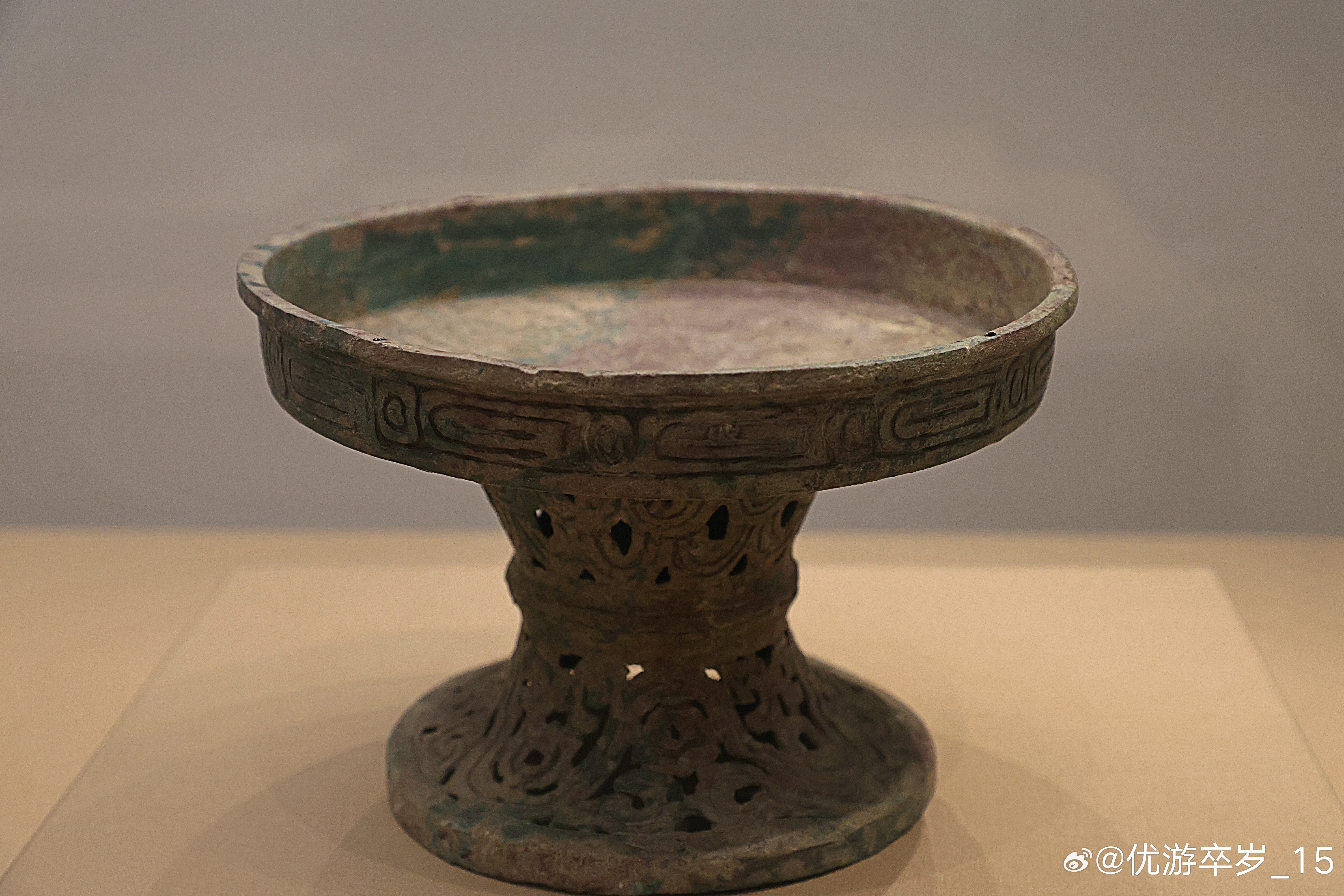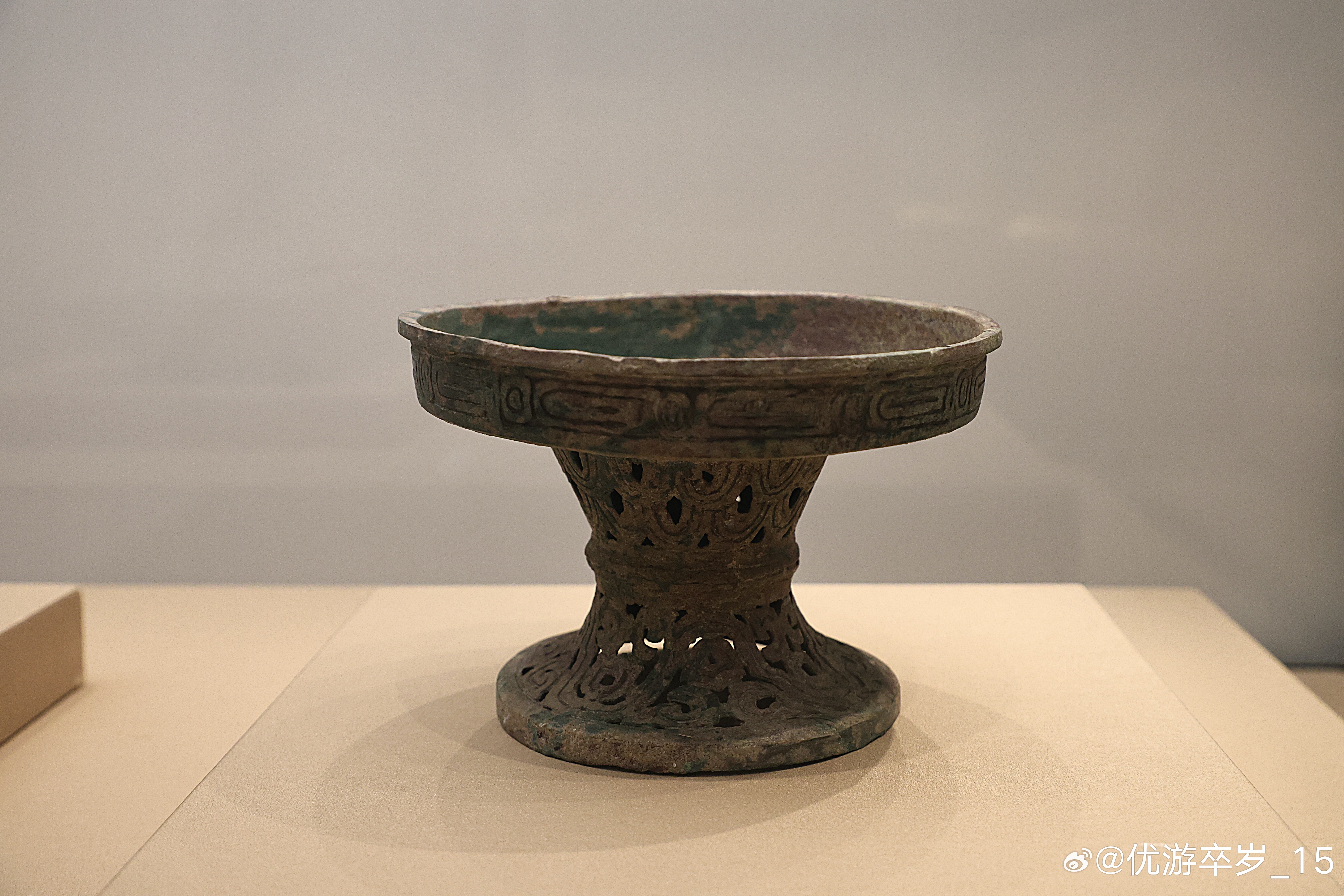 我的2026 【中国之中-中原古代文明精粹】 镂空波曲纹铜铺西周(公元前1046-前771年)三门峡市虢国博物馆藏1991年河南三门峡虢国墓地M2012出土。盛行于两周,用于盛放肉、酱一类的食器。浅盘,直口平折沿,盘腹近直,至底作浅圜底,腹壁饰一周有珠重环纹;盘下承接束腰柄,柄中部起一道凸箍,柄部自凸箍以上,满饰层层相叠的垂鳞纹;凸箍下部接喇叭形高圈足,足沿外折,足壁之上,镂空饰出连绵起伏的山形纹样。清华大学艺术博物馆展出2026.2.8约会博物馆 文物