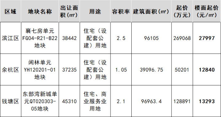 3月6日一早,杭州又挂牌了三宗宅地,分别位于滨江区长河、余杭区闲林和钱塘区东部湾新城,预计4月8日出让。