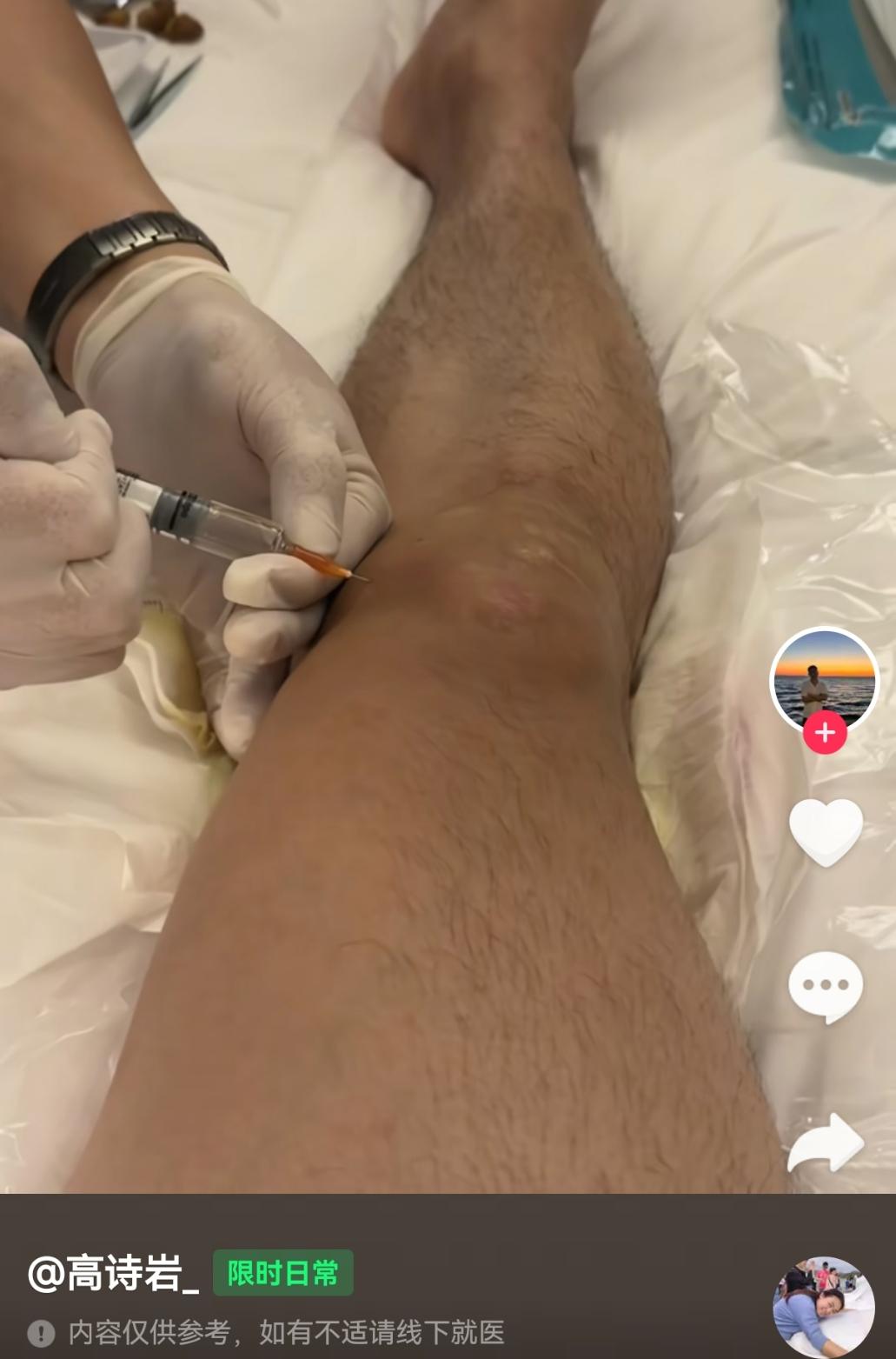 高诗岩在对郭艾伦送上祝福的时候,也晒出了自己的伤病,是医生在为他的膝盖抽积液,他配文称没关系又活了一天! 高诗岩在昨晚山东队对阵广州的比赛中发挥不佳,三分球三中零进攻犹豫组织也不到位,还凶了不给他传球的谢智杰。 大家觉得高诗岩的能力当不起山东队长,他把伤病晒出来表示不是打不好是因为受伤了,早在之前高诗岩就说过没有人赶得上他疲惫。