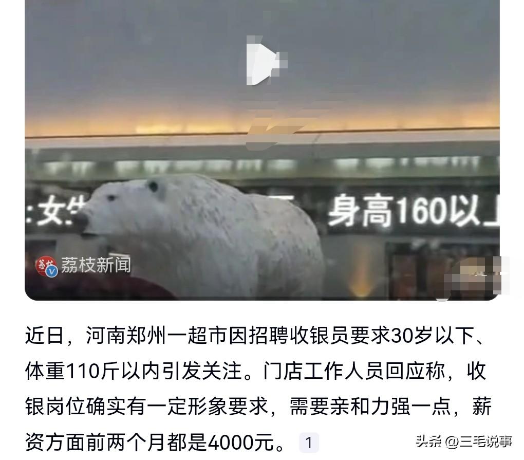 这也太离谱了吧,这么卷的吗?这真的是做了一个很不好的示范呀。 近日河南郑州,一个超市招收银员,条件是30岁以下体重110斤以内。 想不到竟然连体重都限制上了,这是招选美的吗? 这真的是太卷了。