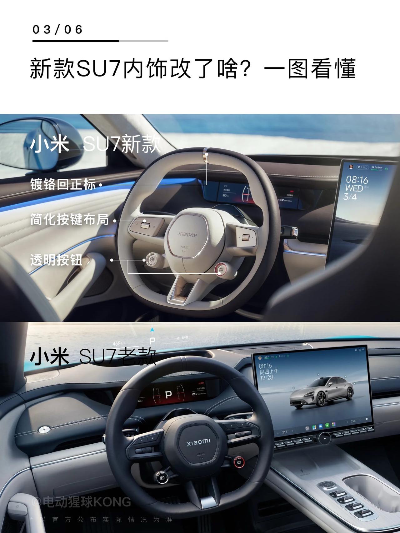 新款小米SU7内饰公布,中控扶手改动较大,浅色方向盘真可以,座椅和门板都增加了纹路。总体改动不大,细节处感觉更规整和精致了,你觉得改的怎么样?小米su7