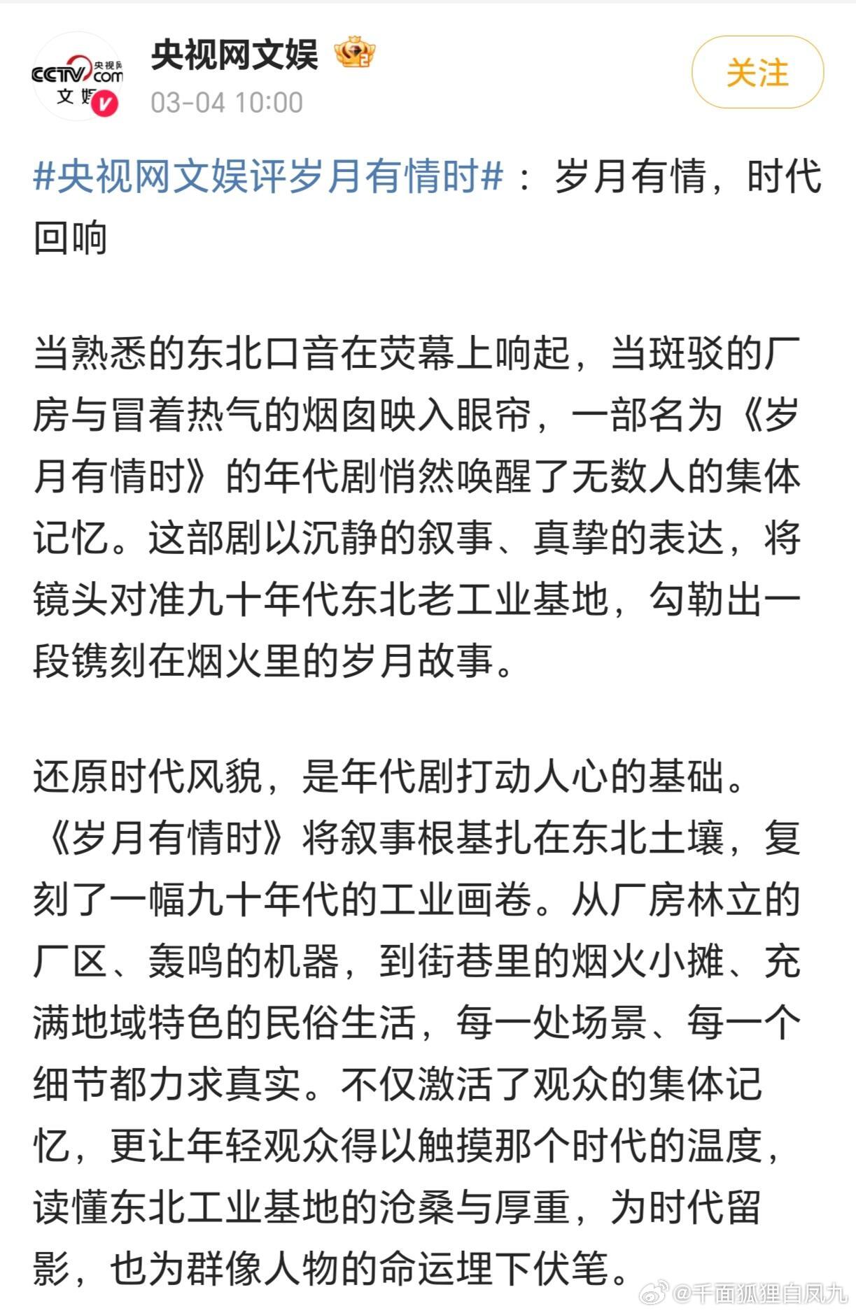 同时被央妈和新华社选中的年代剧同时被央妈和新华社选中的年代剧就是这么有底气!敬畏时代、敬畏人生,无条件偏爱电视剧岁月有情时 的原因藏在剧中每一个细节里~剧里东北老城区烟囱里冒出的热气、旧厂房的斑驳锈迹和质朴又动人的情感,把九十年代的厚重与温度拍得触手可及。黄景瑜、关晓彤、王天辰等演员也跳出了演技舒适圈,用松弛又有层次的表演把东化厂子弟的挣扎、坚守与抉择演得生动如生活,有人留守家园,有人奔赴远方,每个选择都带着时代的烙印。这部剧不仅展示了旧时光的风貌,更让我们在他们的命运里体会到同为平凡人的起落,剧中对于“家”的诠释又让人感到无比温馨,无论发生什么,家总是能让我们安睡、能为我们兜底的港湾。刚追完就开始想念剧中的每一个角色啦,《岁月有情时》真是怎么也看不腻!