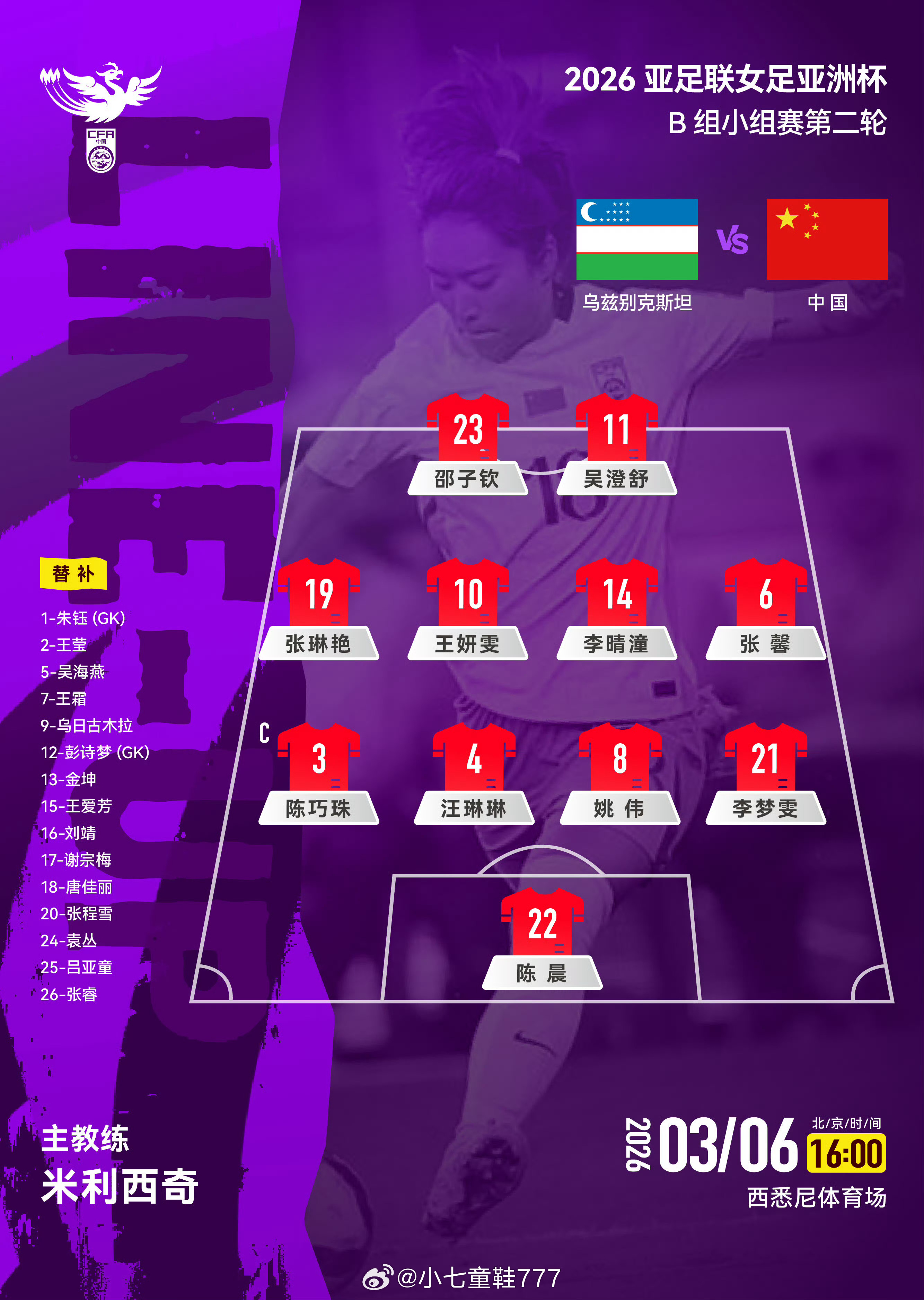 2026亚足联女足亚洲杯B组小组赛第二轮,中国女足对阵乌兹别克斯坦女足首发阵容。武汉车谷江大女足陈晨继续首发,王霜、吴海燕和姚伟替补待命。