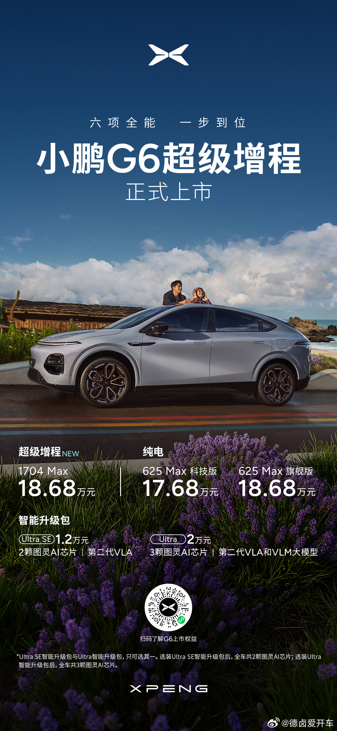 小鹏G6超级增程正式上市,售价 18.68万元起,共推出 1704 Max、Ultra SE、Ultra 三个版本。小鹏G6超级增程18.68万起即日起至月底下定可享最高 33200元限时权益:包含5000元新春购车补贴、至高9300元金融/选装基金(二选一)、至高5000元置换权益、至高13500元复购权益以及400元交付礼。