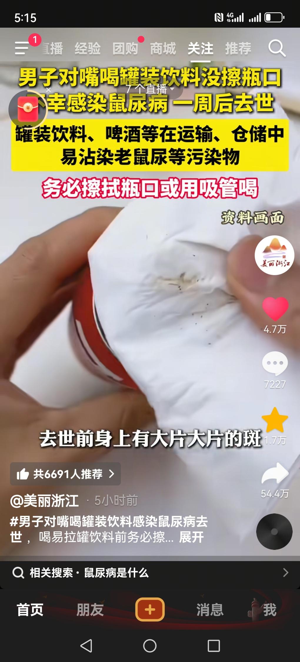 真的是活到老学到老。 刚刚看到新闻,一个男子喝罐装饮料,喝之前没有擦拭灌装口,不幸感染鼠尿病,一周以后就去世了。我想大部分人可能都是直接就对嘴喝下去的,并没有擦拭灌装口的习惯。直接对嘴喝罐装饮料,主要有这几个卫生+健康风险,很多人都忽略了: 1. 罐体表面很脏 易拉罐在生产、运输、货架、仓库堆放过程中,会沾到灰尘、细菌、霉菌、蟑螂/老鼠爬过的痕迹,甚至有人手反复触摸。 直接对嘴喝,等于把罐口的脏东西一起喝进去。 2. 容易引发肠胃不适 罐口常见大肠杆菌、金黄色葡萄球菌等,抵抗力弱一点就可能: - 拉肚子 - 腹痛 - 肠胃炎 3. 铝罐涂层/金属风险 长期频繁直接咬罐、大力对嘴喝,可能: - 微量铝离子析出增多 - 罐口磨损、划伤嘴唇、口腔 4. 密封被破坏,不知道放了多久 有些罐看起来没开封,其实拉环被人偷偷开过再按回去,直接喝有变质、被下毒的极小概率风险。 最简单安全的做法 - 喝之前用纸巾/清水擦一下罐口 - 最好倒杯子里喝 - 不要用牙咬、啃易拉罐(图片信息来源:美丽浙江)鼠尿病 尿感染 溴鼠灵中毒 讲卫生 讲卫生的意义有多重要