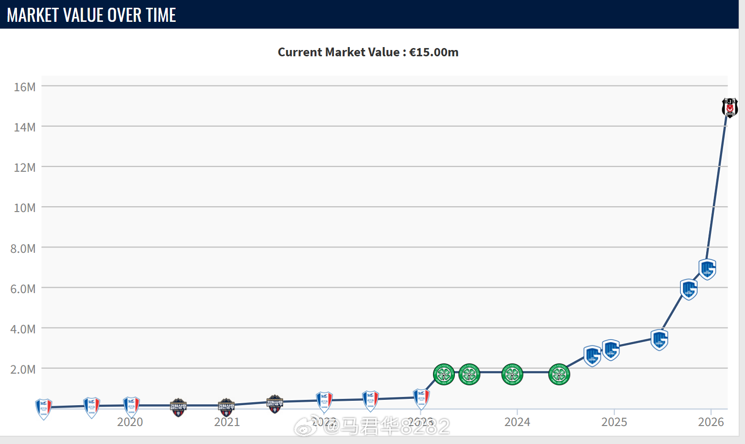 凭借加盟贝西克塔斯后5场4球的表现,吴贤揆的身价近期已经翻倍,达到1500万欧元。(€15.00m)🚀