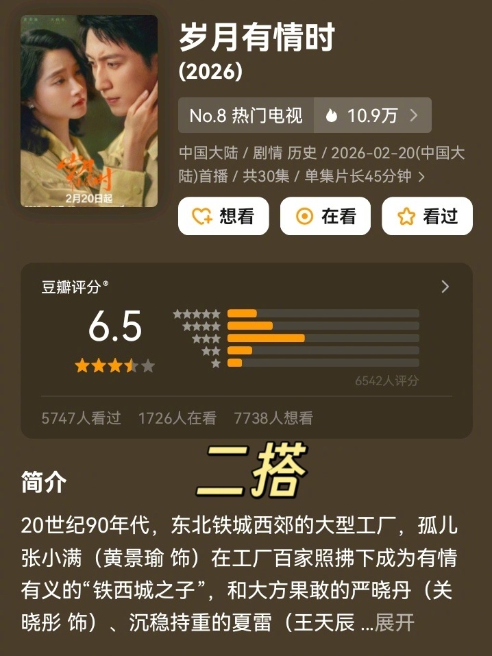 黄景瑜、关晓彤二搭新剧开分了!《岁月有情时》6.5分,6k+人打分~跟一搭的作品比,这次口碑进步明显,至少是及格线以上了岁月有情时开分6.5