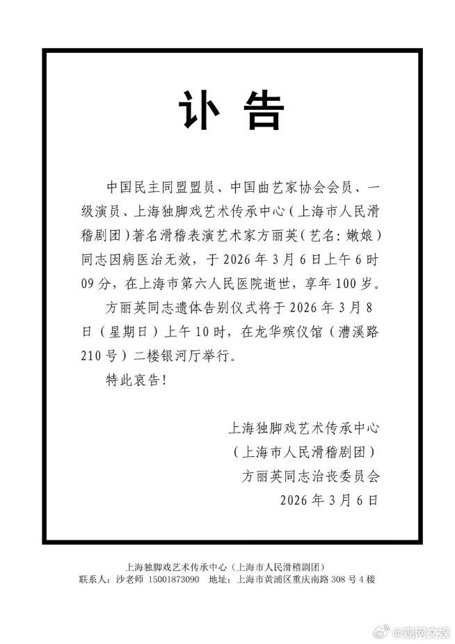 【滑稽表演艺术家方丽英去世】方丽英曾获周恩来总理接见据新民晚报,从(上海市人民滑稽剧团)获悉,中国民主同盟盟员、中国曲艺家协会会员、一级演员、著名滑稽表演艺术家方丽英(艺名:嫩娘)因病医治无效,于2026年3月6日上午6时09分,在上海市第六人民医院逝世,享年100岁。