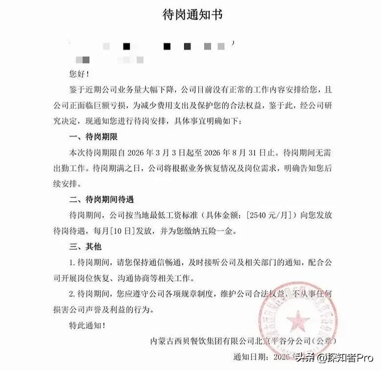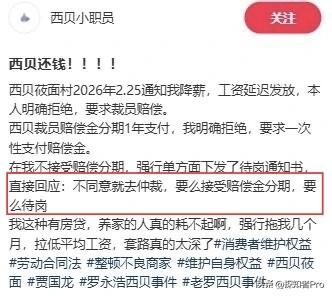 3月6日,西贝:“不行就去仲裁” 之前1月份,贾国龙还朋友圈说:“员工工资一分都不会差”。结果呢?3月6日内部通知一出来,直接给中层骨干集体缓发工资。 更绝的是——当天23点前离职,工资正常发。贾总的这一波操作,算是在变相逼人走吗? 店长降薪30%,签还是不签?不签?待岗半年,每月拿两千多最低工资。那些入了股的员工更惨,钱退不出来。员工问怎么办,得到的回复是:不行就去仲裁。 最讽刺的是什么?贾国龙本人,这次全程隐身。 1月刚说完“回归一线”,3月就玩起了“找不到人”。员工连这是不是他的意思都不知道。 一边是融资、资本青睐,一边是基层员工被“劝退”无补偿。西贝这艘大船,船员在沉,船长却不见了。 打工人能怎么办?评论区聊聊你的看法。 (来源:凤凰财经)