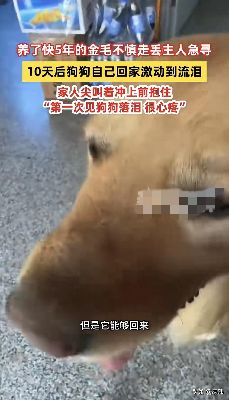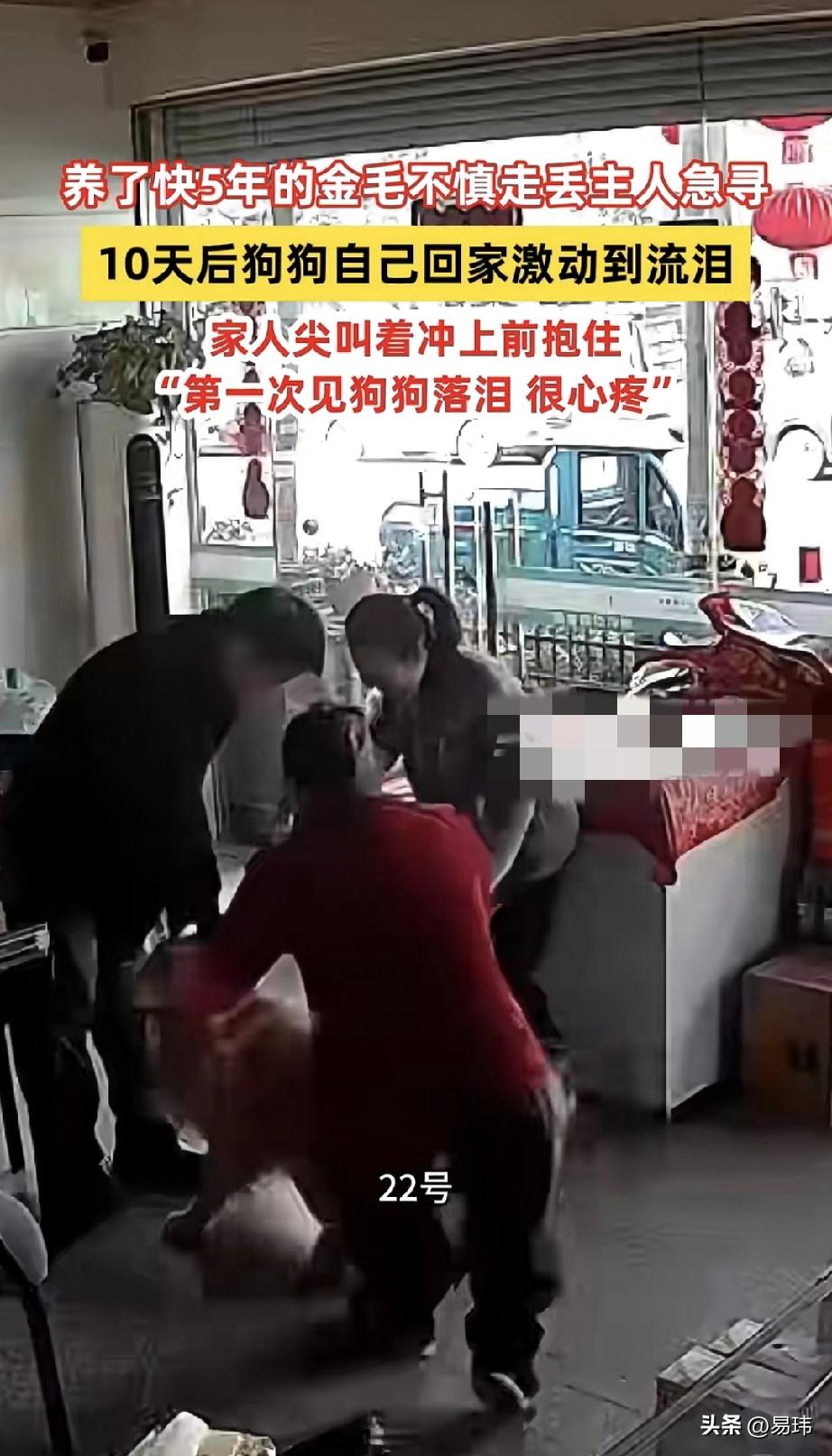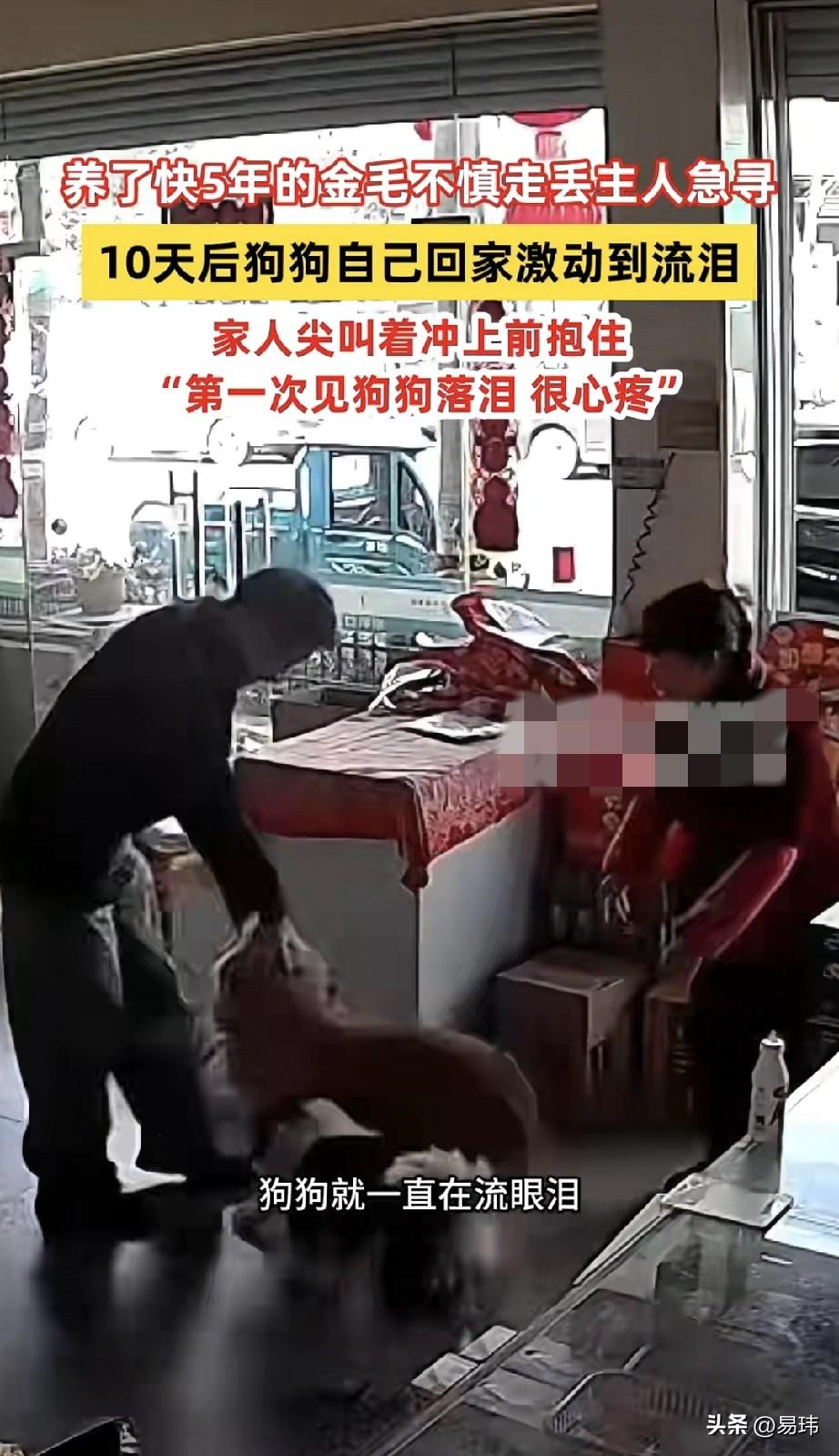 泪目了!一位开超市的阿姨养了一只金毛狗狗,五年来一直对它照顾有加,可这天金毛狗狗跟着邻居的小白狗出去玩,结果到天黑都没有回来。阿姨这才发现不对劲,金毛似乎是丢了。 于是心急如焚的阿姨发动了全家人以及周边邻居一起寻找狗狗,结果却一无所获,可她并没有放弃寻找。可遗憾的是还是没有找到它。这之后几天阿姨每天都郁郁寡欢的,谁知,第十天的时候,阿姨正在店里守店。居然看到金毛狗狗回来了,阿姨尖叫着上前抱住狗狗,这种失而复得的喜悦实在太开心了!也不知道狗狗经历了什么,它一直流着泪!不过这次之后,阿姨他们一定会更加珍惜这份感情了,也会更加认真的看护狗狗了。