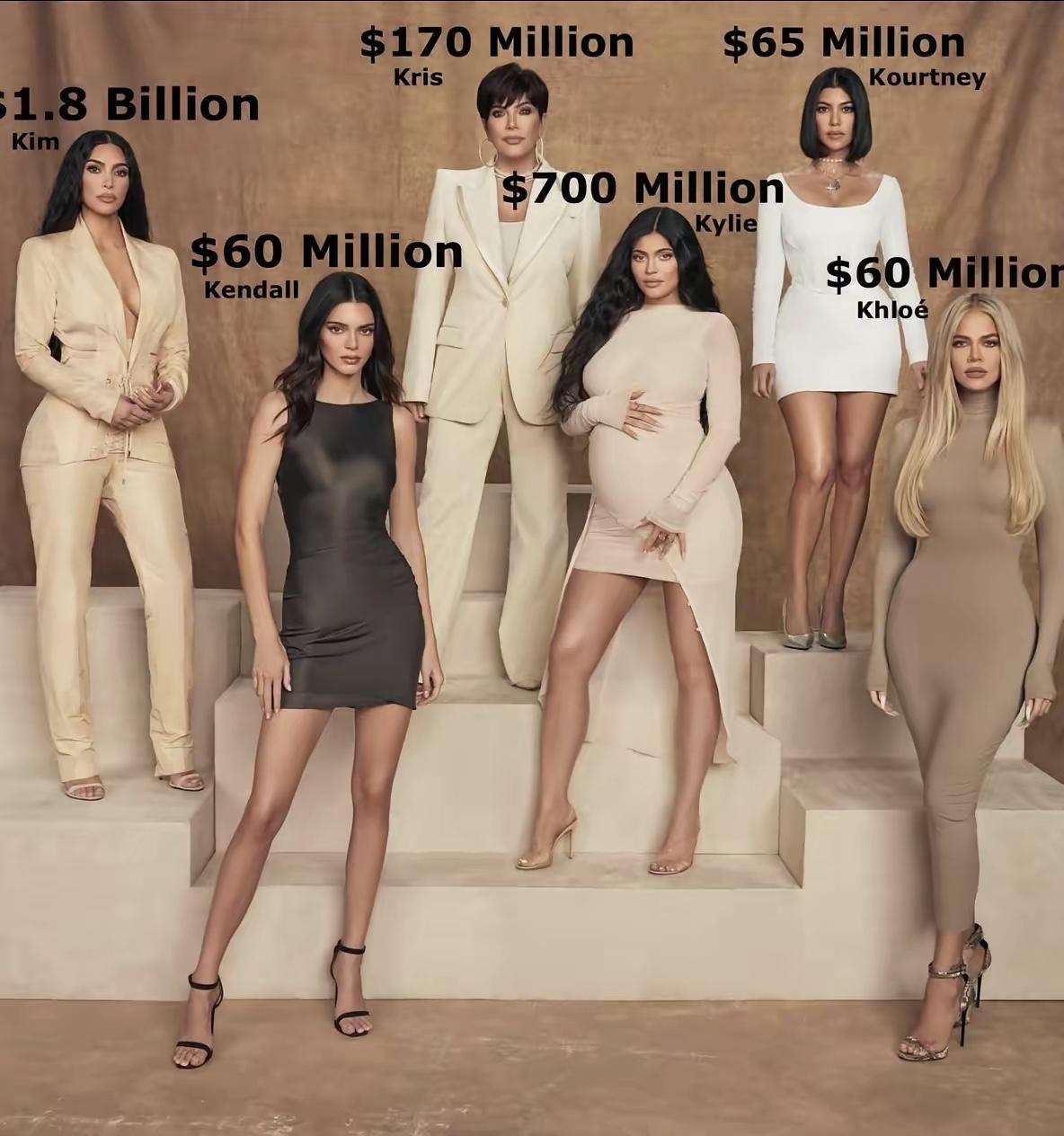 卡戴珊一家的身价也太惊人了吧!老妈克里斯1.7亿,大姐考特尼6500万,金姐直接18亿,科勒、肯豆各6000万,凯莉7亿。果然金姐最有钱,不过听说老妈更疼凯莉,毕竟她超会赚钱~ 这一家子靠真人秀和各种品牌,把名气变成钱,也是真有本事啊。