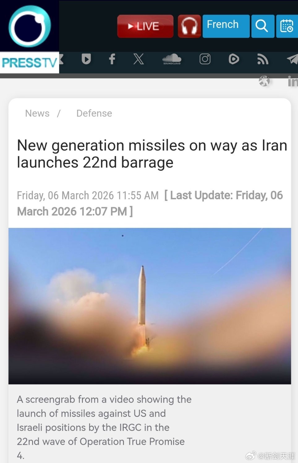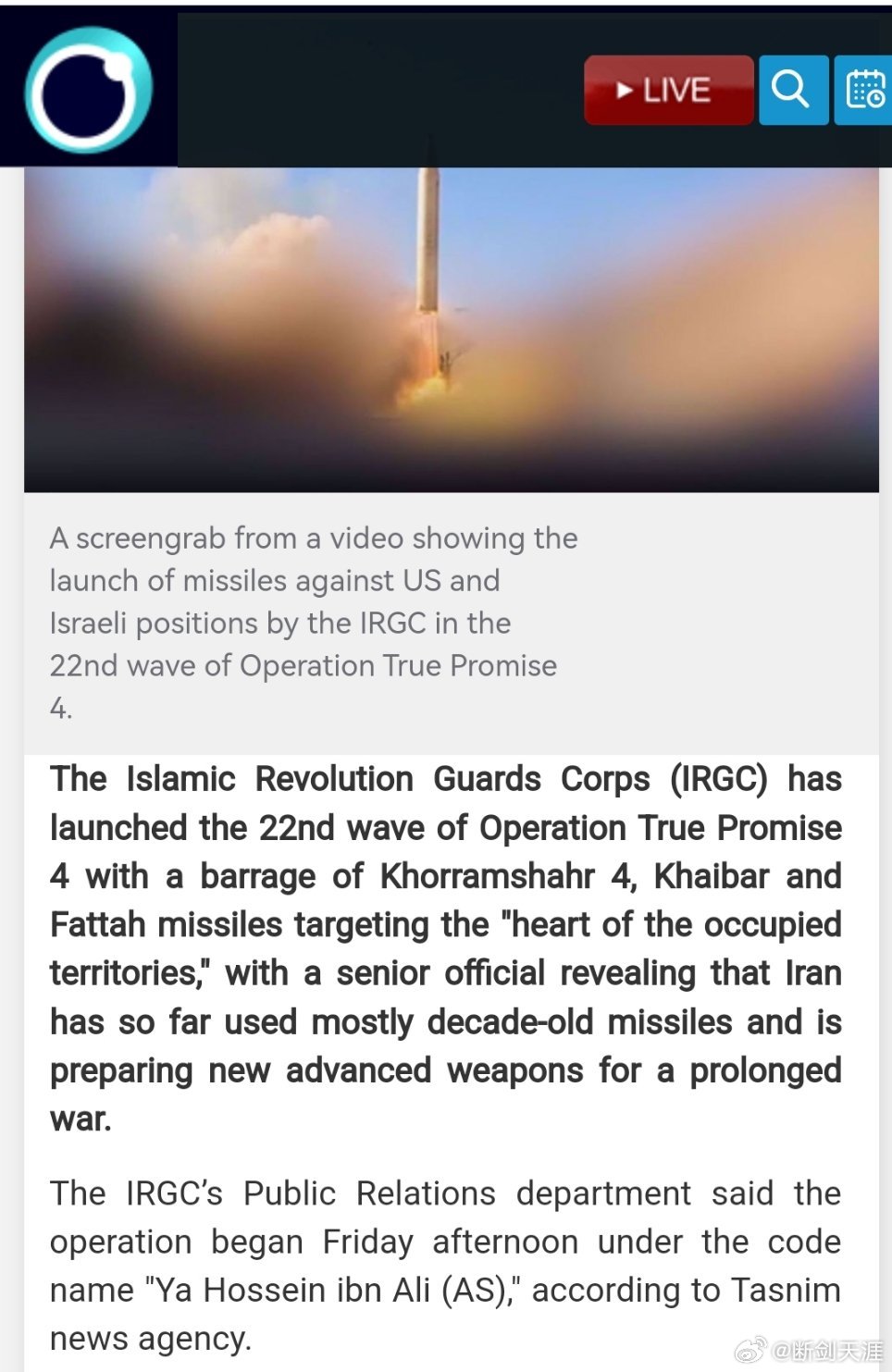 伊斯兰革命卫队(IRGC)已启动“真承诺 4 号行动”的第 22 次行动,一名高级官员透露,伊朗迄今主要使用的是几十年前的导弹,并正在准备用于长期战争的新型先进武器。(伊朗官网)