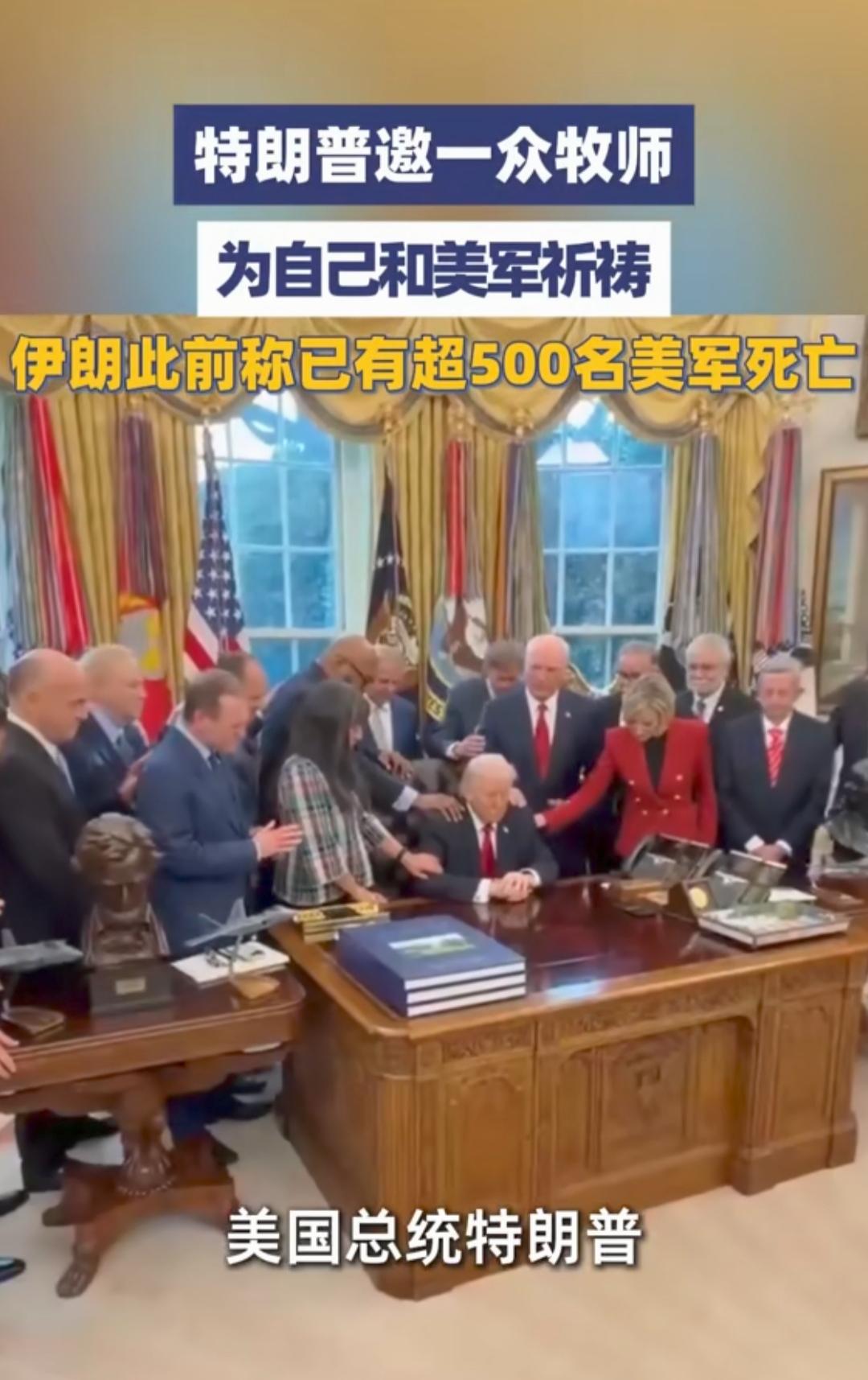 打不倒伊朗,特朗普要请上帝帮忙。特朗普把一群牧师请到自己的办公室,给自己施法,希望能打败伊朗。 3月5日,白宫椭圆形办公室上演离奇一幕,特朗普被一众牧师团团围住,众人手搭肩头,齐声祈祷美军击败伊朗、护佑总统。他一边宣称对伊行动“无时间限制”,一边把胜败押给上帝,堪称现实版“求神打仗”。 特朗普是一个非常迷信的人,一到关键时刻,他就要求助神力。2020年大选的时候,他也曾让牧师祈祷“打败恶魔对手”,但是没起到作用,结果还是惨败拜登。 如今战局胶着,美军补给吃紧,伊朗反击未停,眼看着美国连伊朗也打不过,他又要求助上帝的力量。 现代战争拼的是体系与实力,不是牧师的祷词。若祈祷管用,还要航母与轰炸机何用?这场“神圣加持”,不过是他面对困局的无能逃避,更是对美军士兵与战争本质的最大轻慢。