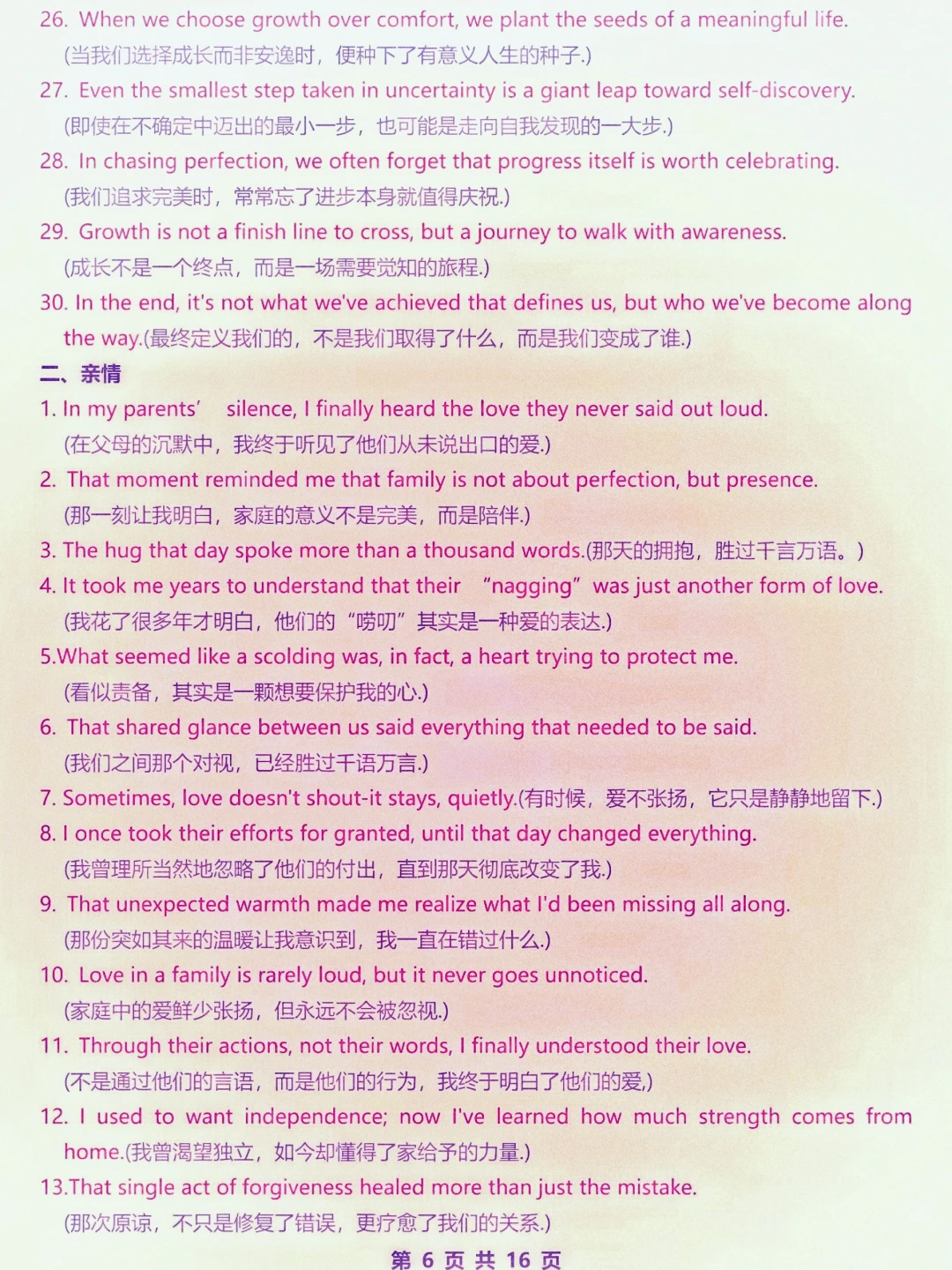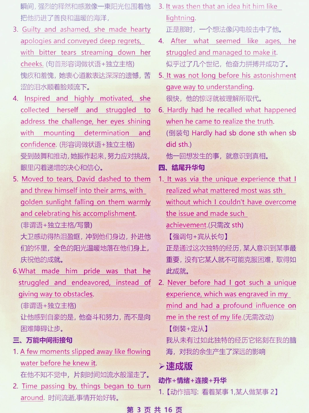 (一)基础版 第一段: 万能句 1. Fixing my eyes on it, I was overwhelmed by mixed feelings. 紧盯着它,我被复杂的感觉淹没。 2. Hearing that, sb. failed to utter a single word, totally amazed. 听到这,某人说不出话,全是惊讶 3. Thinking about the situation, I was fully aware that immediate action should be taken.考虑到当时的情况,我完全意识到应该立即采取行动, 4.Reflecting on what had happened, I had a moment of enlightenment 回想发生的一切,我顿时恍然大悟 5.Thinking for a while, she came to realize what happened and what to do.思考了一会儿,她意识到发生了什么以及该怎么做。 6. Inspired, he collected himself and made a quick decision. 到鼓舞,他振作起来,迅速做出了决定。 7. Plucking up courage, he made up his mind to address the challenge. 鼓起勇气,他下定决心迎接挑战。 8. Without delay,she began to take action.毫不拖延,她开始采取行动 9. Raising her head, she rose to her feet.抬起头,她站了起来。(积极) 10. Dropping her head, she bit her lips hard. 低下头,她狠狠地咬了咬嘴唇。(消极)