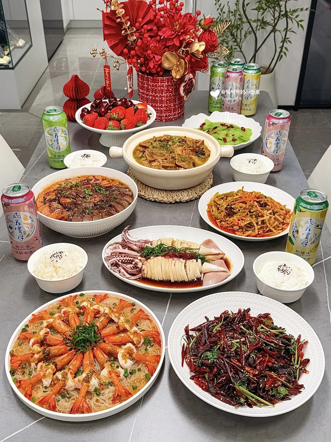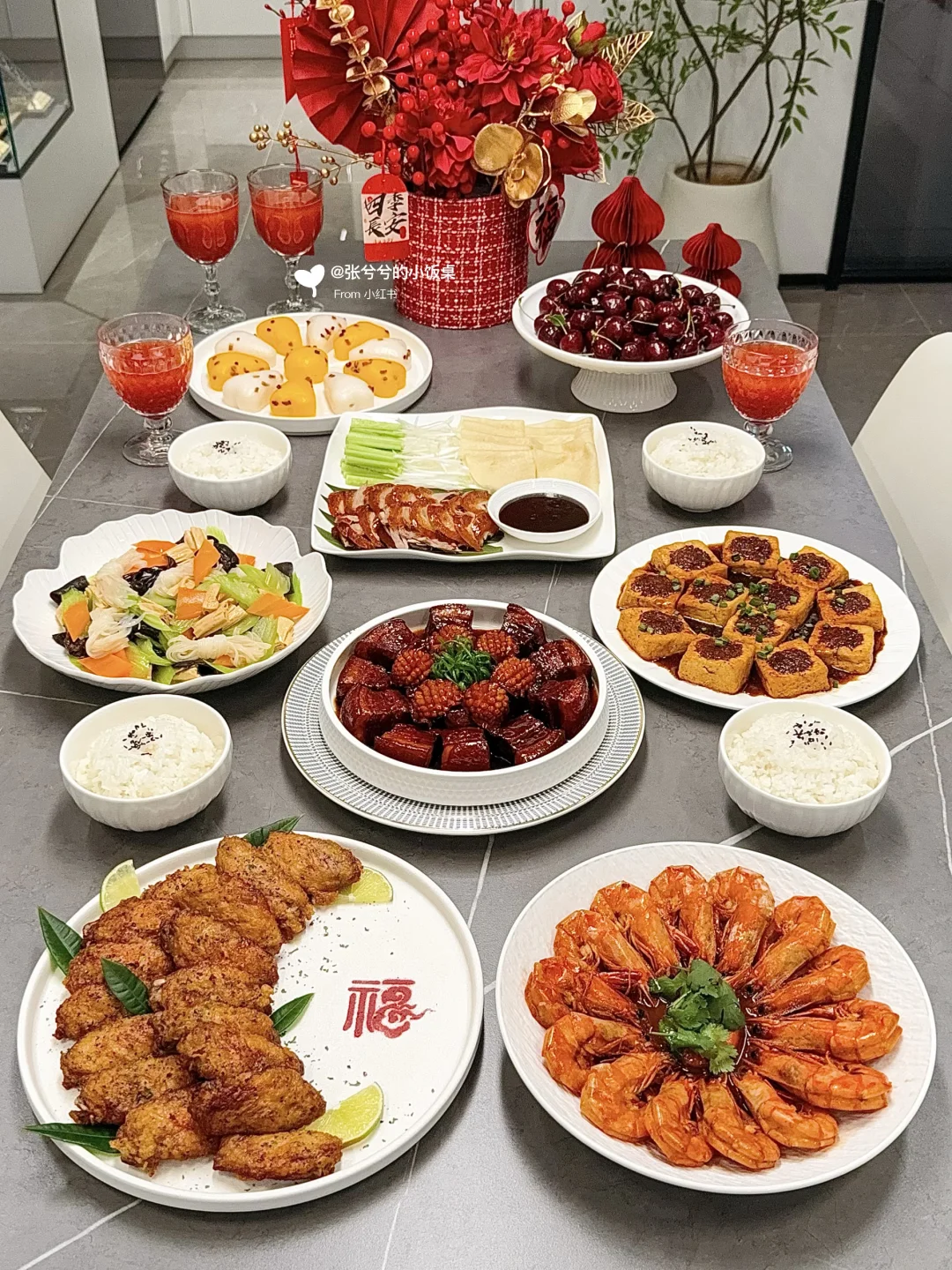 🌈家宴菜单分享: 图1️⃣:清蒸鲈鱼虾➕时蔬烤鸡翅➕京酱肉丝➕糖醋小排➕麻婆豆腐➕白灼秋葵➕车厘子蛋挞 图2️⃣:蒜蓉粉丝虾➕麻辣牛肉条➕白灼鱿鱼➕小鸡炖蘑菇➕毛血旺➕鱼香肉丝➕凉拌西芹 图3️⃣:鲍鱼红烧肉➕椒盐鸡翅➕北京烤鸭➕油焖大虾➕客家酿豆腐➕凉拌素什锦➕金银发糕 图4️⃣:花开富贵虾➕小酥肉➕水煮鱼➕香辣鱿鱼➕羊肉萝卜汤➕凉拌素什锦➕黄米凉糕 图5️⃣:红烧狮子头➕干炸带鱼➕椒盐虾➕蒜蓉粉丝娃娃菜➕手撕鸡➕白灼秋葵➕五彩水饺