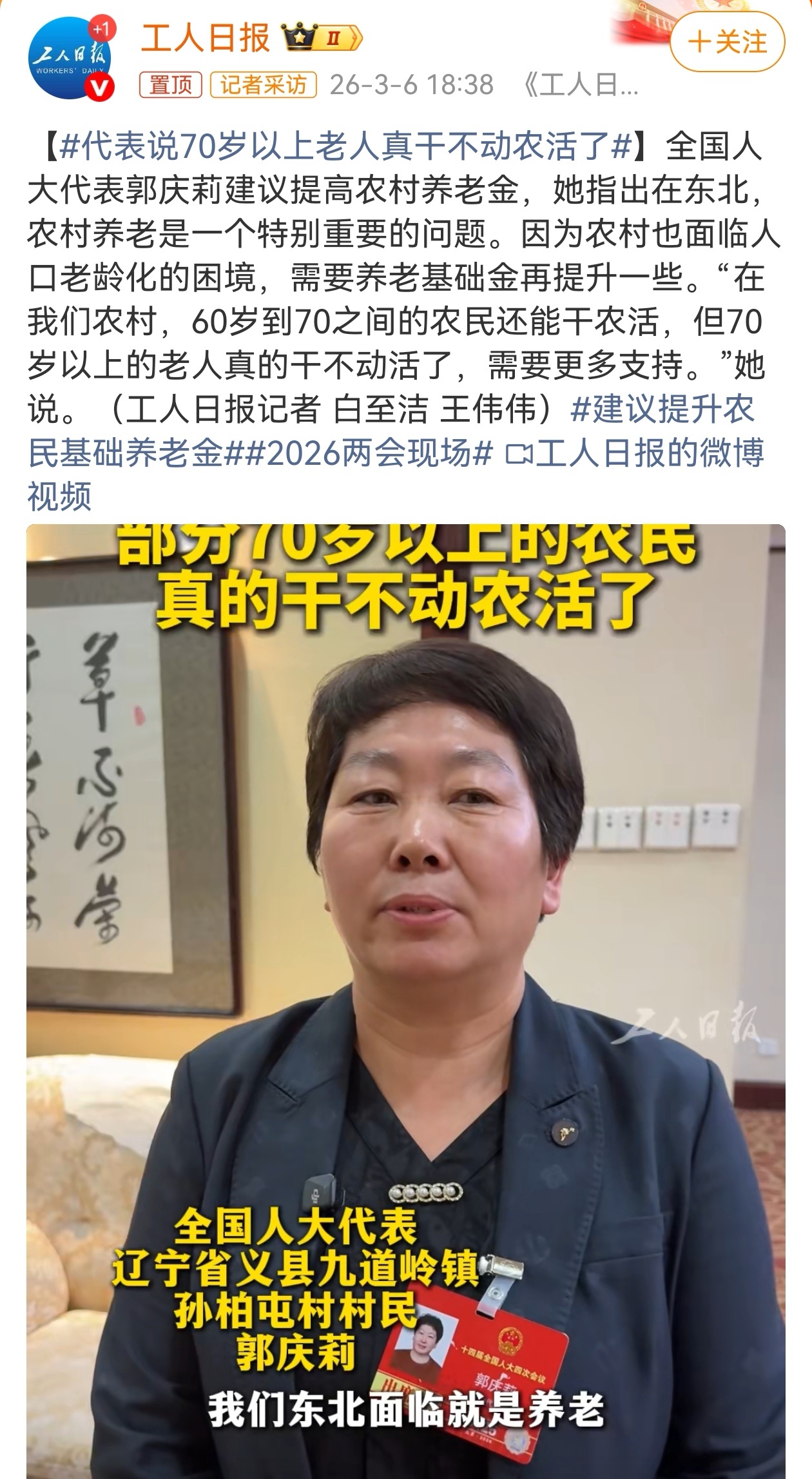 在城市退休职工养老金连续20年上涨的背景下,农村基础养老金最低标准不应停留在143元/月,尤其是农村老龄化问题远大于城市,70岁以上、丧失劳动能力的农村老人,若无子女赡养或积蓄,基本生活难以保障。代表说70岁以上老人真干不动农活了