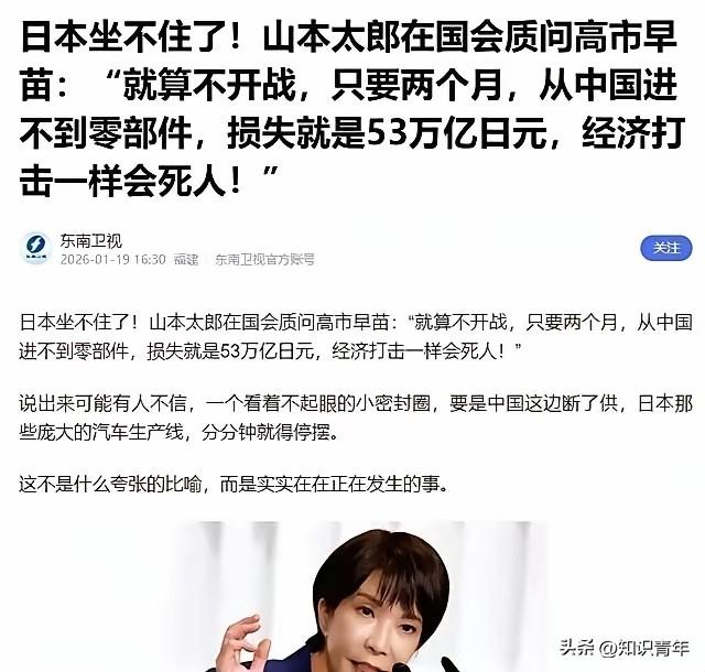 日本彻底坐不住了!山本太郎曾在国会一针见血!他直言:“中国的军队从未侵略过日本,反而是我们曾经多次侵略过中国,在中国的土地上烧杀抢掠。”与此同时,他警告高市早苗:“就算不开战,只要两个月,从中国进不到零部件,损失就是53万亿日元,经济打击一样会死人!” 山本太郎这番话,像一块石头砸进了日本政坛那潭表面平静的死水,溅起的全是真相的水花。在右翼势力不断炒作“中国威胁”、试图修改和平宪法的今天,一个日本政治家能当着全国的面,把历史罪责说得这么直白,把经济依赖算得这么清楚,需要的不只是勇气,更是一种罕见的清醒。他撕开了一层窗户纸:对日本而言,最大的威胁可能不是中国的军舰,而是切断与中国经济血脉后,自己内部的大出血。 那53万亿日元的数字,不是吓唬人的。它背后是日本经济一个冰冷的事实:离开了“中国制造”,日本很多产业根本转不动。从汽车里的电子控制单元、机器人身上的精密轴承,到智能手机的核心元器件,中国不仅是世界工厂,更是全球供应链无可替代的枢纽。日本车企比如丰田、本田,在中国有庞大的生产基地和销售市场,更依赖从中国进口的稀土、电池材料和成千上万的二级、三级零部件。两个月断供?恐怕不用两个月,很多日本工厂的流水线就得停工,4S店里的新车就无法交付,整个产业链的震荡会像多米诺骨牌一样,瞬间传导到就业、税收和股市。经济打击一样会死人,这话一点不假,企业倒闭、工人失业、社会动荡,都是看不见血的“战争”。 山本太郎的厉害之处,在于他把历史和现实这两本账,一起摊在了桌面上。历史账上,日本欠中国的,是血债,是道义上的巨大赤字。现实账上,日本依赖中国的,是生计,是经济上的生存红线。那些整天叫嚣对抗的右翼政客,比如他点名的高市早苗,往往只煽动历史仇恨带来的情绪,却故意忽略现实利益交织的捆绑。他们想把日本绑上美国战车,去进行一场豪赌,却忘了赌注是日本普通国民的饭碗和未来。 这种理性的声音在日本不是没有,只是常常被淹没。日本经济界、产业界心里跟明镜似的,知道和中国“脱钩断链”是自杀行为。但很多政客为了选票,迎合国内民族主义情绪,或者为了向美国表忠心,故意装聋作哑。山本太郎站出来,其实是替很多不敢说话的日本企业家和普通人,说出了他们憋在心里的大实话:对抗中国,日本玩不起。 他的发言也折射出日本社会一种深层的焦虑和分裂。一边是挥之不去的历史负罪感,另一边是对中国崛起的复杂心态,既有恐惧也有羡慕。如何与这个强大的邻居相处,是战后日本一直没解好的题。是继续跟着美国指挥棒,把自己变成对抗前沿的“矛”,还是找回外交自主性,做沟通东西方的“桥”?山本太郎的警告,或许是在呼吁一种更务实、更基于自身利益的选择:承认历史,面对现实,在相互依存中寻找安全,而不是在对抗中走向共同毁灭。 这对中国也是个启示。山本太郎这样的声音,是中国长期坚持和平发展、深度融入全球产业链所孕育出的“理性回报”。它证明,经济上的深度融合,本身就能塑造政治上的稳定力量。当相互依赖达到一定程度,发动对抗的成本就会高到让任何理性的决策者望而却步。维护好这条共同的经济命脉,扩大日本国内这种“务实派”的声音,比单纯的外交抗议或军事威慑,可能更具有长远和根本性的意义。 说到底,国家之间,尤其是邻国之间,最牢固的护栏不是铁丝网和导弹,而是千丝万缕、你中有我的共同利益。山本太郎算清了这笔账,他的话能不能叫醒那些装睡的日本政客,我们拭目以待。但至少,他让更多人看到,在战争与和平的选择题之外,还有一道更复杂的生存应用题,而答案,就写在中日两国每天数以亿计的商品流动和资本往来里。 各位读者你们怎么看?欢迎在评论区讨论。