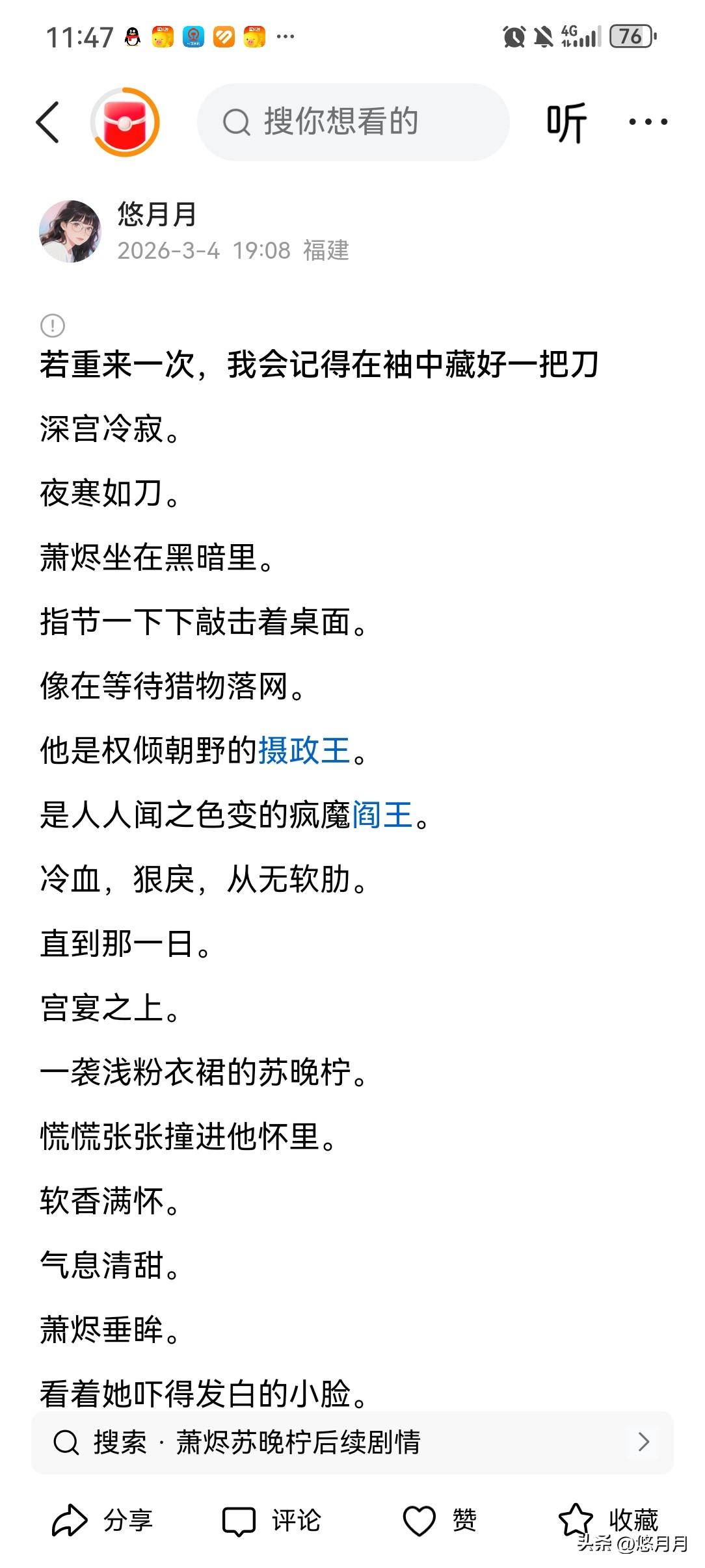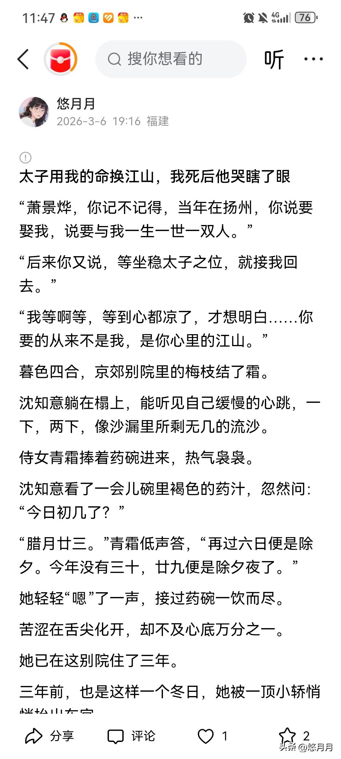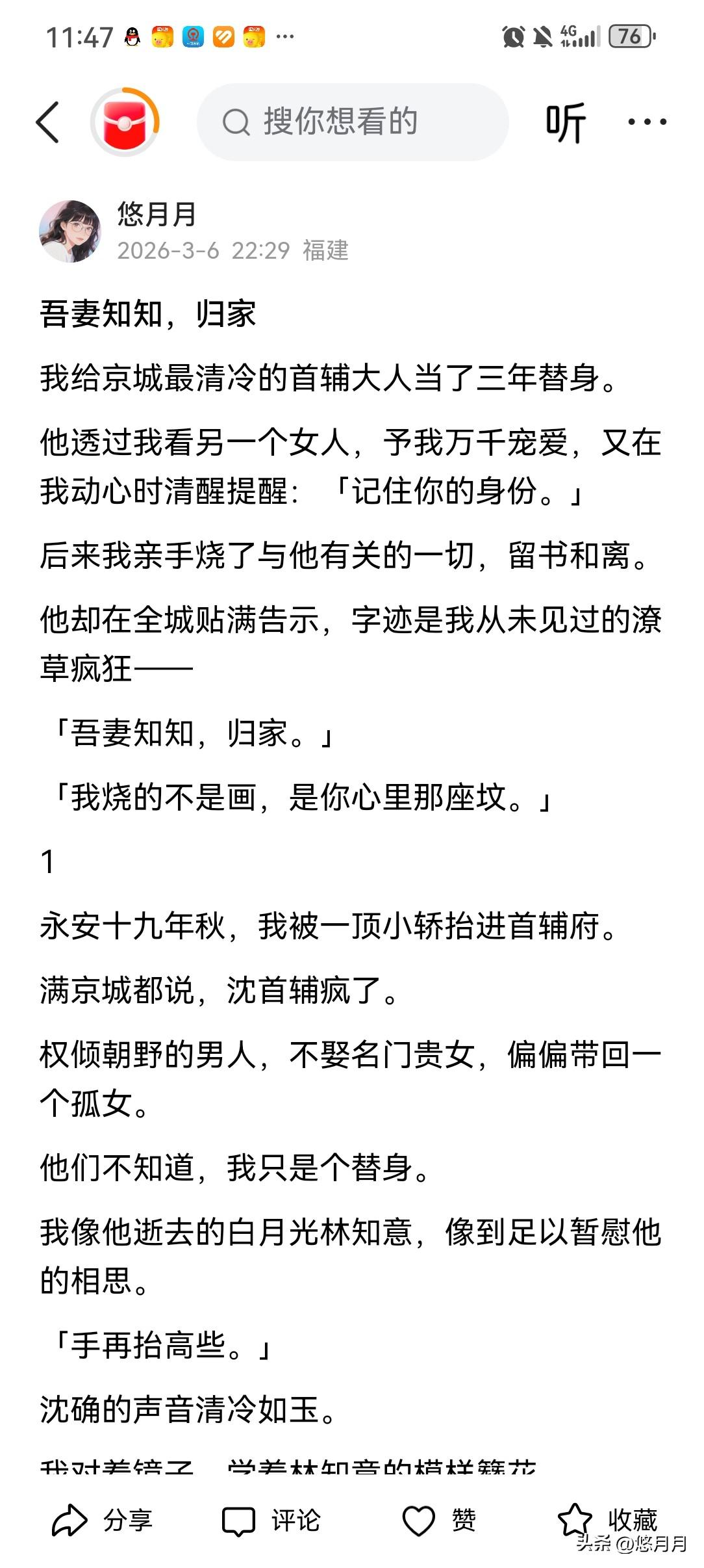 有没有自己写的小说 有啊,当然有。 不是名家大作, 不是爆款IP, 只是我想讲给你听的故事。 写过权倾朝野的清冷权臣, 写过满身伤痕的复仇者孤女。 写过三年卑微替身, 写过一把烧尽过往的烈火。 写过他冷漠开口: “你只是赝品。” 也写过他后来疯魔满城, 贴满一纸潦草又滚烫的字: 吾妻知知,归家。 有人说虐, 有人说爽, 有人说看完一夜难眠。 其实我写的哪里是小说。 是藏在字里行间的心动、遗憾、不甘, 和一点点, 想让所有真心都被善待的私心。 如果你刚好路过, 愿意停下来, 读一读我的文字吗?