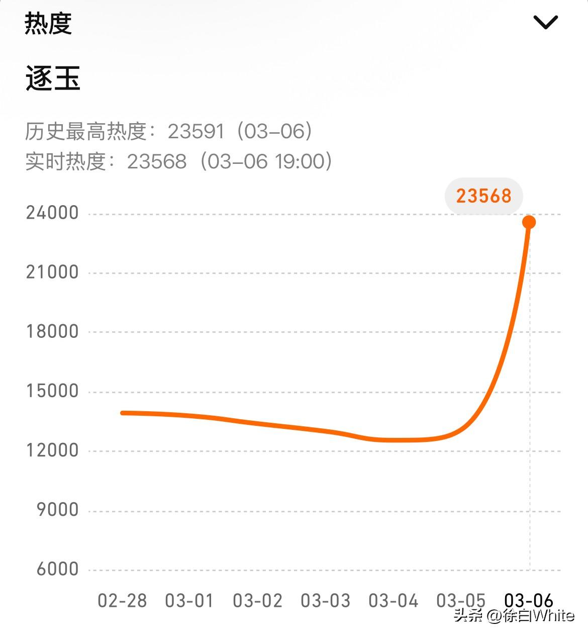 3月6日,张凌赫田曦薇《逐玉》开播 6点开播,6点15破23000,热搜吹了一个小时,7点热度23568,这下谁吹谁尴尬! 按道理首次开播后1-2小时热度飙升是最快的,毕竟有99999免费日卡,还有源源不断的云包场,23000开局,看节奏,今天怎么着也得破个25000才行啊~ 开局评分9.8分也是够扯的,🐧预制破万剧天花板,如果没有这一系列神操作,我还会期待一波,现在……等大结局再看吧! 张凌赫