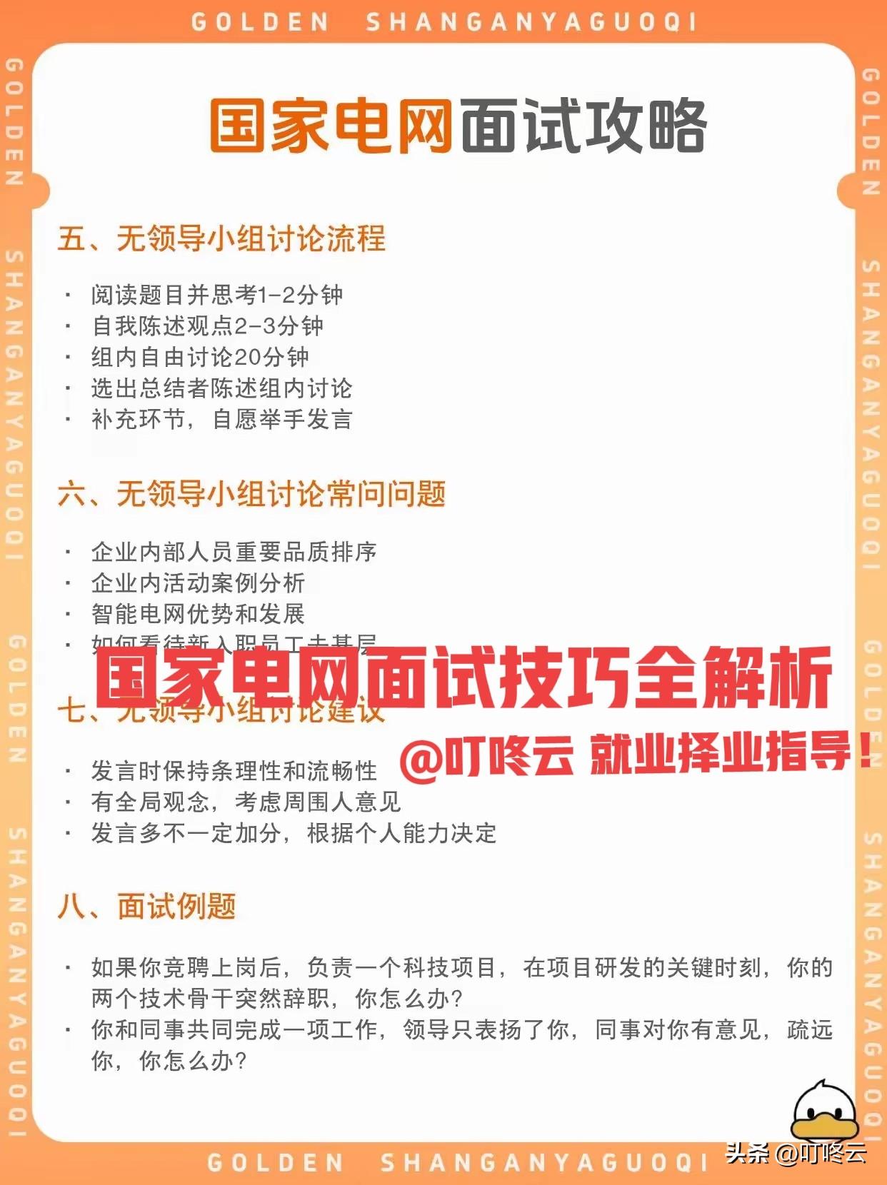 你知道底层逻辑吗?国家电网面试详细攻略全解析!本文详细解读国家电网面试通关秘籍:数据说话,拿捏“金饭碗”!速速围观揭秘详细内容![点亮平安灯][点亮平安灯] @叮咚云 帮你画重点和职业指导:想进国家电网?先搞懂面试的“底层逻辑”!从历年数据来看,90%以上的高分选手都精准踩中了面试形式的得分点,这可不是玄学,是硬实力的体现。[送自己一朵花][送自己一朵花] 1.自我介绍环节,本科生90秒、研究生150秒的时间限制,本质是在考验你“抓重点”的能力。能在规定时间内,把个人技能和对电网的了解讲清楚的同学,通过率比泛泛而谈者高出62%。毕竟,电网要的不是“话痨”,而是能精准输出价值的“靠谱人”。[烟花][烟花] 2.结构化面试主打一个“标准化”,像“偷电窃电看法”“电力系统暂态稳定性”这类问题,看似刁钻,实则是在筛选专业人才。数据显示,能结合行业案例作答的考生,专业能力评分直接拉满。而半结构化面试的“灵魂拷问”,比如“是否服从调剂”,回答“愿意”的同学,上岸概率直接翻倍,毕竟电网更看重“大局观”。[福][福] 3.无领导小组讨论则是“社牛”的主场,9-10人一组的设定,就是要选出能“carry全场”的leader。记住,面试不是玄学,用数据武装自己,才能在这场“金饭碗”争夺战中C位出道![赞][赞] 欢迎关注@叮咚云 将优先为粉丝职业规划指导,为你定制最适合的就业择业方案!欢迎留言交流讨论。[来看我][来看我] 免责声明:图片来自网络,仅供参考 春招招聘岗位 央国企招聘 国企央企招聘 军工央国企招聘