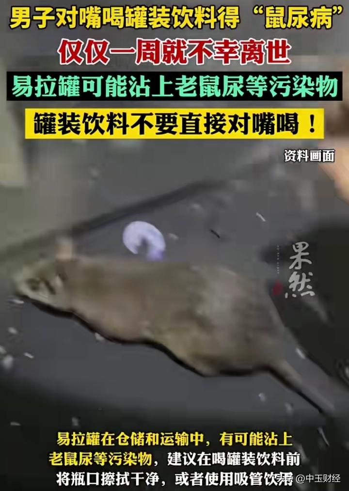 务必提高警惕! 这个视频十分及时且优质,它提醒大家切勿直接嘴对嘴接触易拉罐瓶口饮用,因为易拉罐顶部极有可能被老鼠爬过! 这既是关乎生命的提醒,也是关于健康的警示!