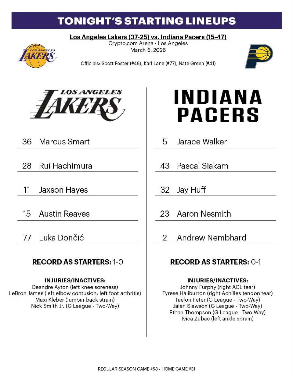 湖人今日首发:里夫斯、八村、海斯、斯玛特、东契奇!步行者vs湖人