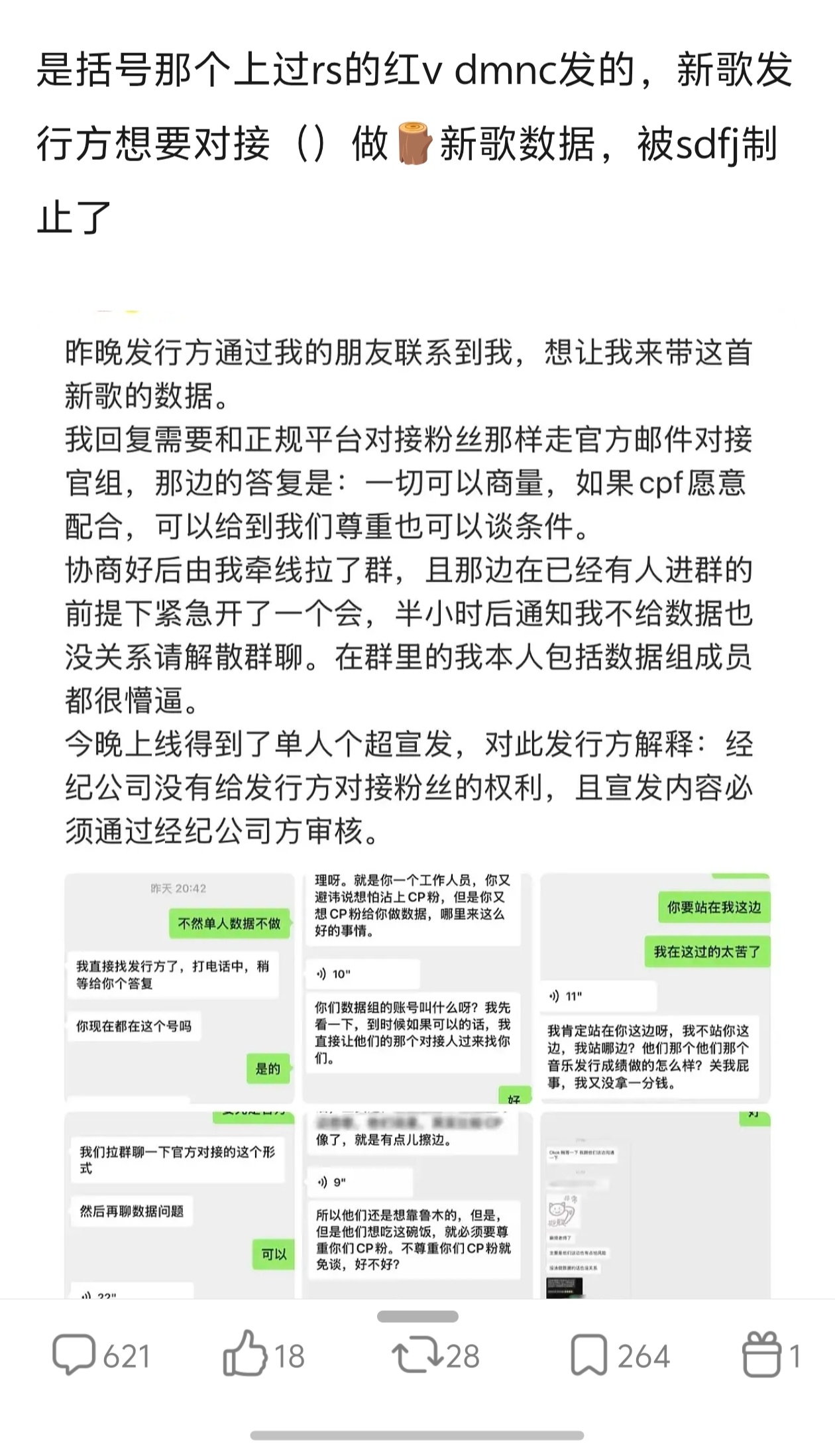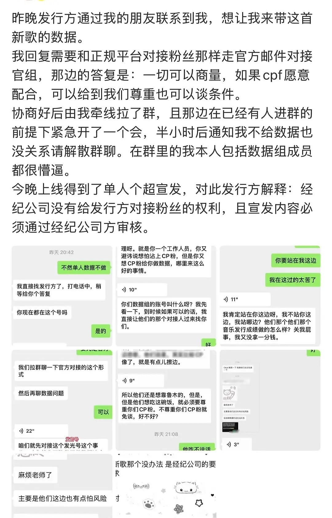 橹穆批红V说穆祉丞新歌发行方联系lmp做数据,被公司制止了。